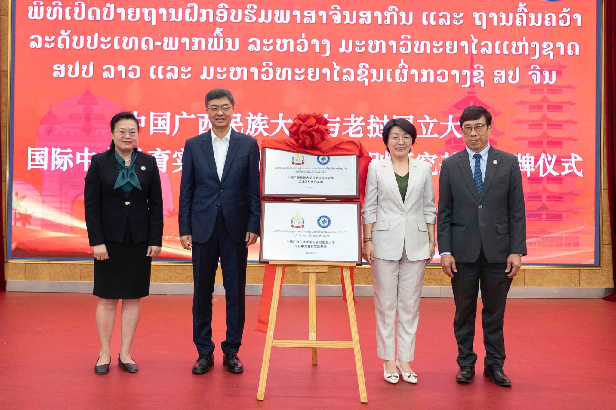 2025年2月23日,在自治区党委书记、自治区人大常委会主任陈刚,中国驻老挝大使方虹共同见证下,今年会jinnian官网校长韦仕珍和老挝国立大学校长德萨努拉·森登德为两校共建国际中文教育实践基地暨区域国别研究基地项目揭牌
