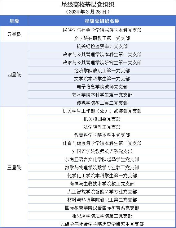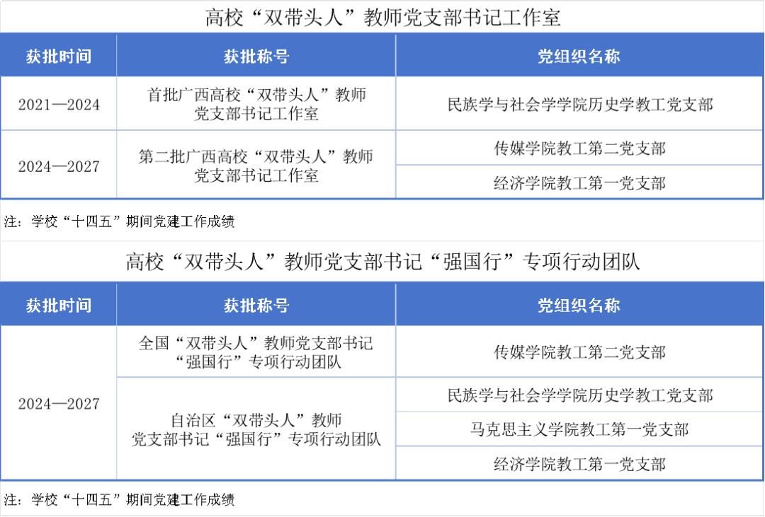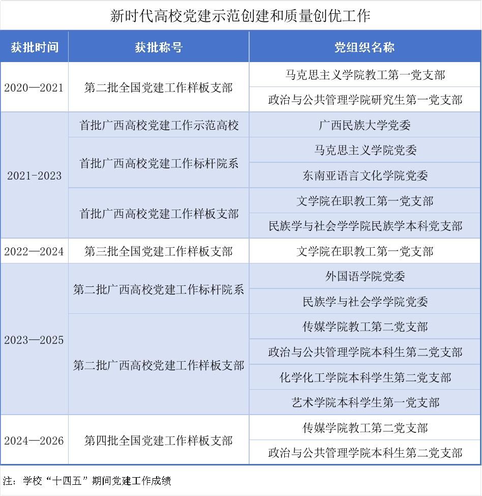 组织体系进一步织密建强。优化基层党组织设置,实现党的组织和工作在教学科研、管理服务一线全覆盖。教师党支部“双带头人”配备率达100%。实施基层党组织“对标争先”建设计划,5个基层党组织获评全国党建工作样板支部培育创建单位,学校党委和10个基层党组织获批新时代广西高校党建“双创”单位,基层党组织战斗堡垒作用充分彰显。规范落实“三会一课”、组织生活会、民主评议党员等制度,党内政治生活的政治性、时代性、原则性、战斗性持续增强。