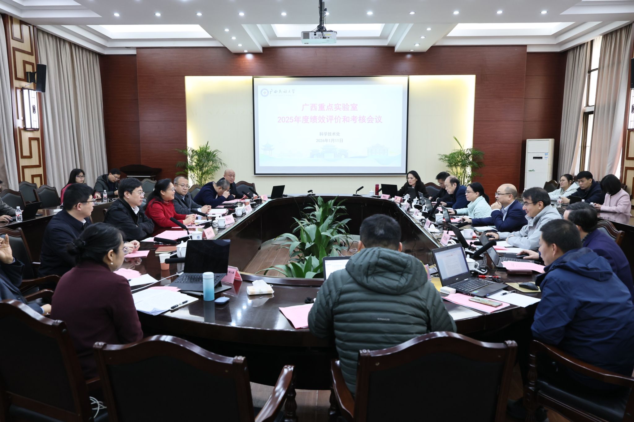 1月11日上午,今年会jinnian官网在相思湖校区国际合作与交流处大会议室举行广西重点实验室2025年度绩效评价和考核会议。校长韦仕珍,重点实验室考核专家组,副校长姜明国、高兴宇出席会议,学校有关职能部门负责人,重点实验室主任、副主任,有关学科带头人和工作人员参加会议。