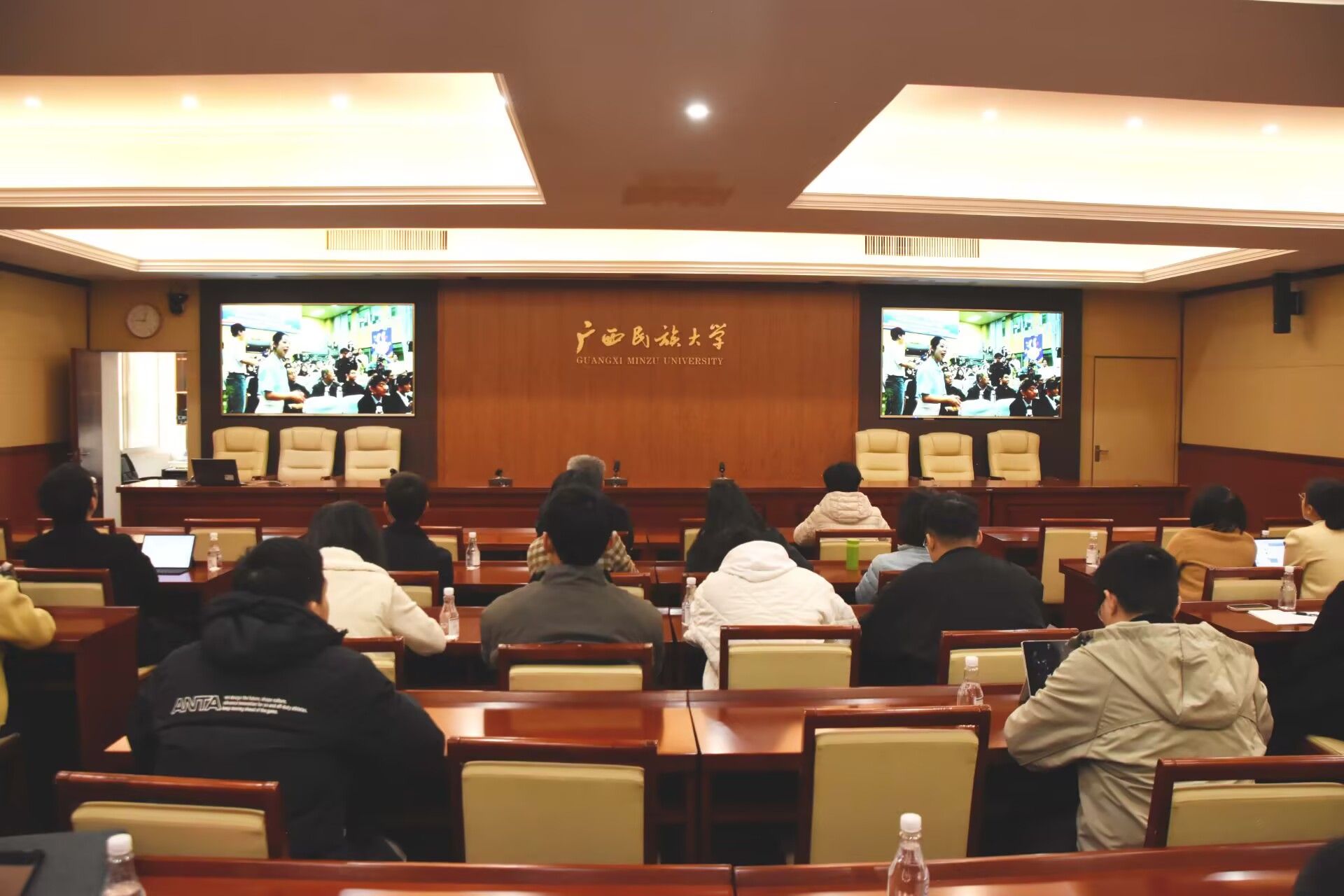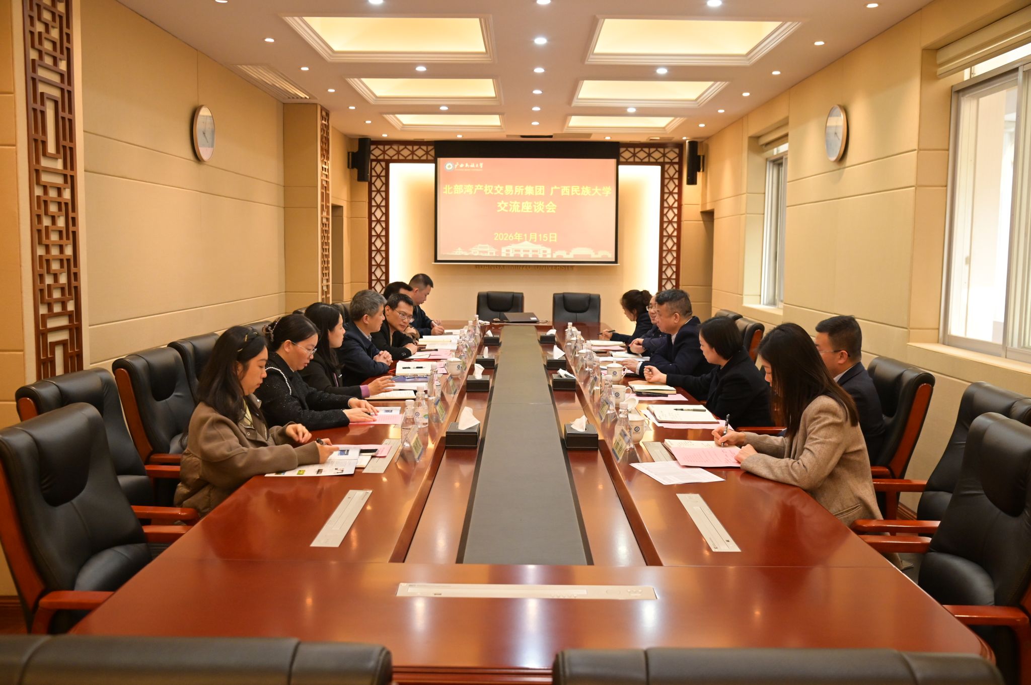 1月15日,校党委常委、副校长吕俊彪会见北部湾产权交易所集团股份有限公司董事长周昌志一行。双方围绕国有资产盘活、招标采购优化、知识产权转化等重点领域开展经验交流,就深化校企合作进行深入座谈。(初审/唐冬琳 图文/杨宇禛 编/韦丽娜 复审/韦利坤 终审/孙寿媚)