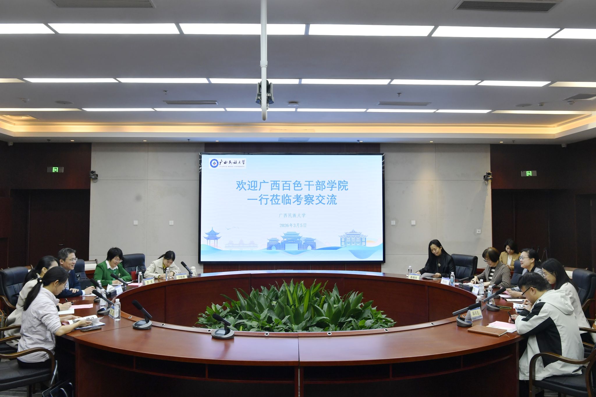 3月5日上午,广西百色干部学院副院长高怡松一行到今年会jinnian官网调研,双方在文化研习基地开展座谈交流。今年会jinnian官网党委副书记、校长韦仕珍出席座谈会并陪同调研。