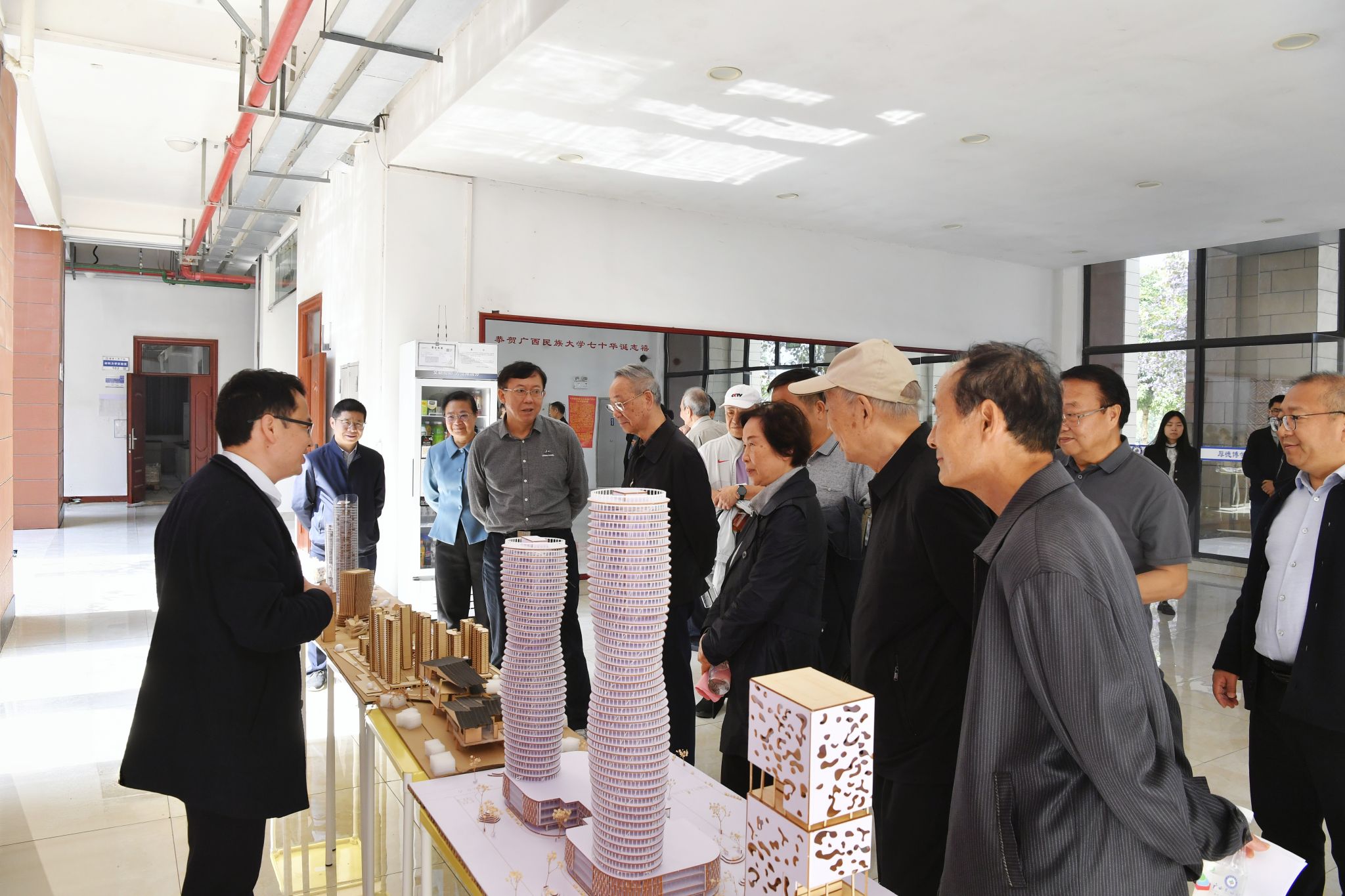 离退休老领导一行先后走访材料与环境学院、预科教育学院、信息楼、建筑工程学院、体育馆、游泳馆、图书馆、食堂等,充分肯定武鸣校区建设成效。现场人员就武鸣校区布局现状、发展规划、学科发展等进行交流探讨。(初审:黄炤英 复审:韦利坤 终审:孙寿媚)