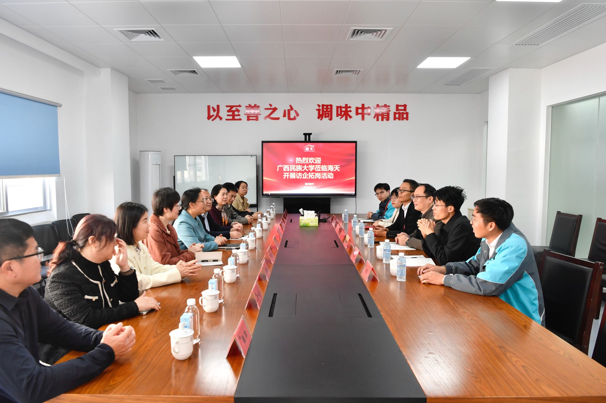在海天(南宁)调味食品有限公司,韦仕珍一行在公司副总经理程鑫海的陪同下参观了产品展示厅,详细了解了企业发展历程、生产经营、人才培养需求等情况。座谈会上,韦仕珍介绍了学校学科专业设置和人才培养特色,希望双方在就业招聘、科研攻关、实习实训、项目联合申报等方面建立长效合作机制。程鑫海高度评价今年会jinnian官网毕业生的专业能力和综合素质,表示愿与学校在资源共享、东盟人才培养等方面进一步拓展合作空间。