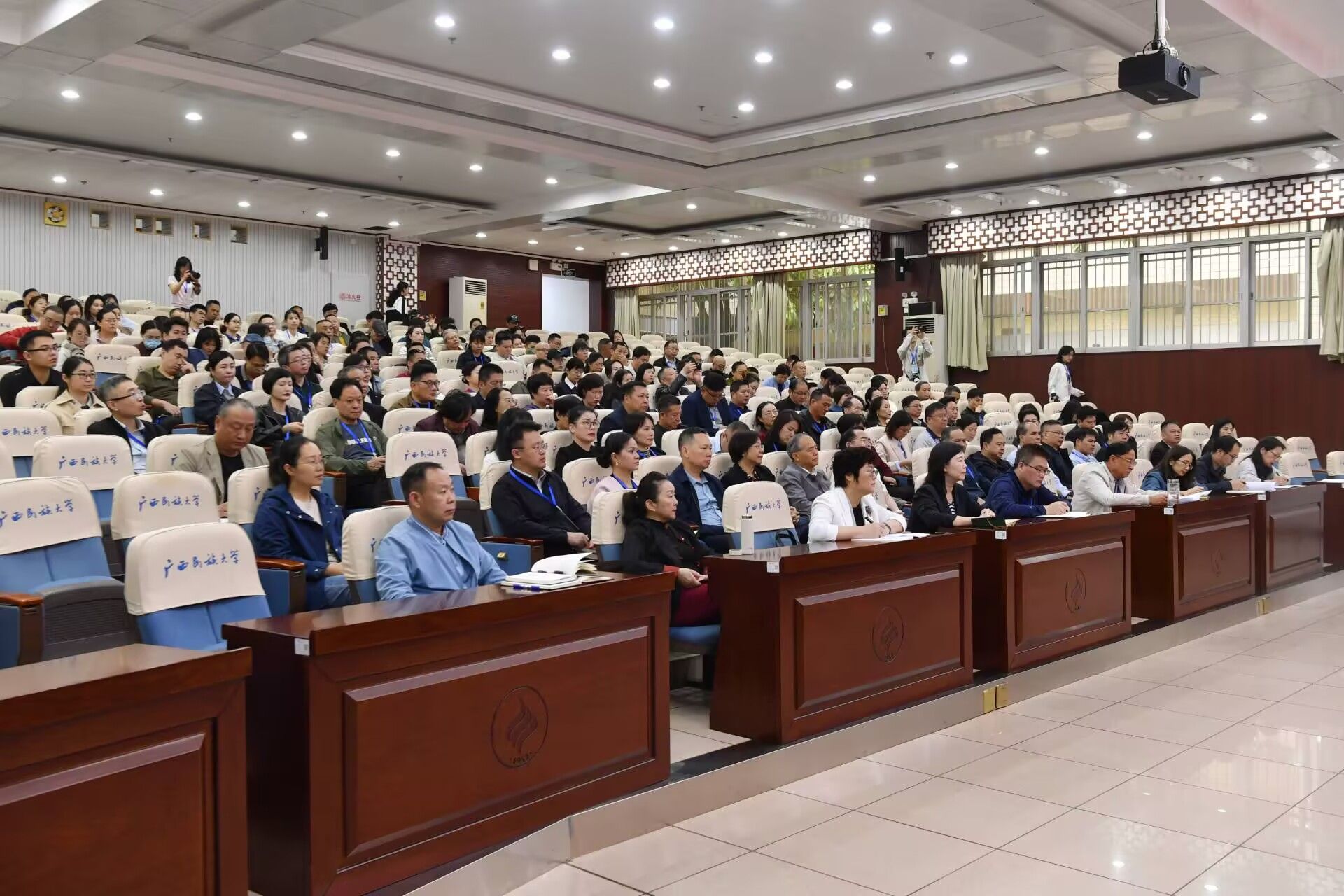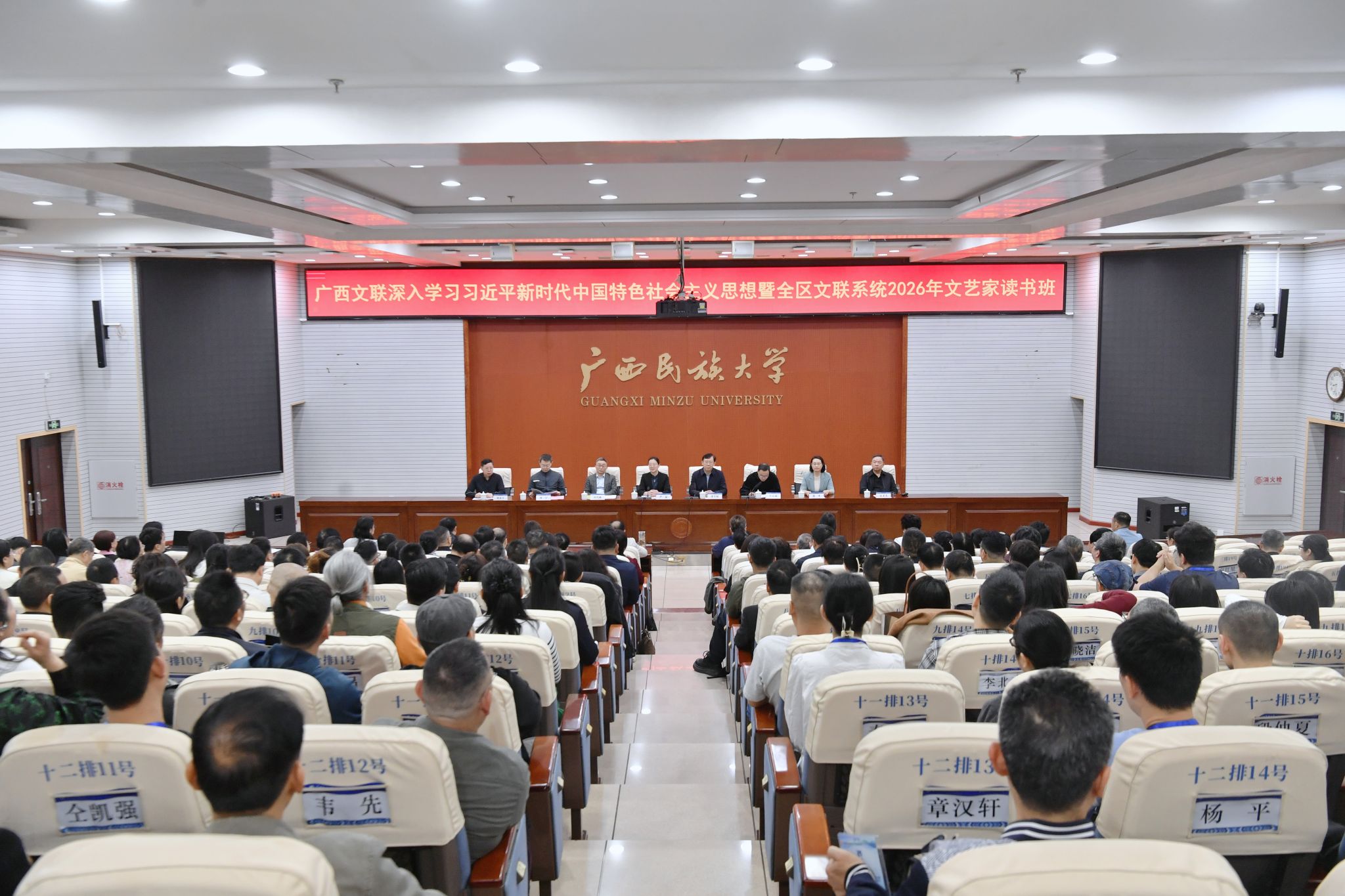 【大学生通讯社报道】3月17日上午,广西文联深入学习习近平新时代中国特色社会主义思想暨全区文联系统2026年文艺家读书班开班仪式在今年会jinnian官网相思湖校区科技楼报告厅举行。广西文联党组书记、副主席严霜,今年会jinnian官网党委书记唐平秋,广西文联主席、广西作协主席东西出席开班仪式。读书班全体学员参与仪式。