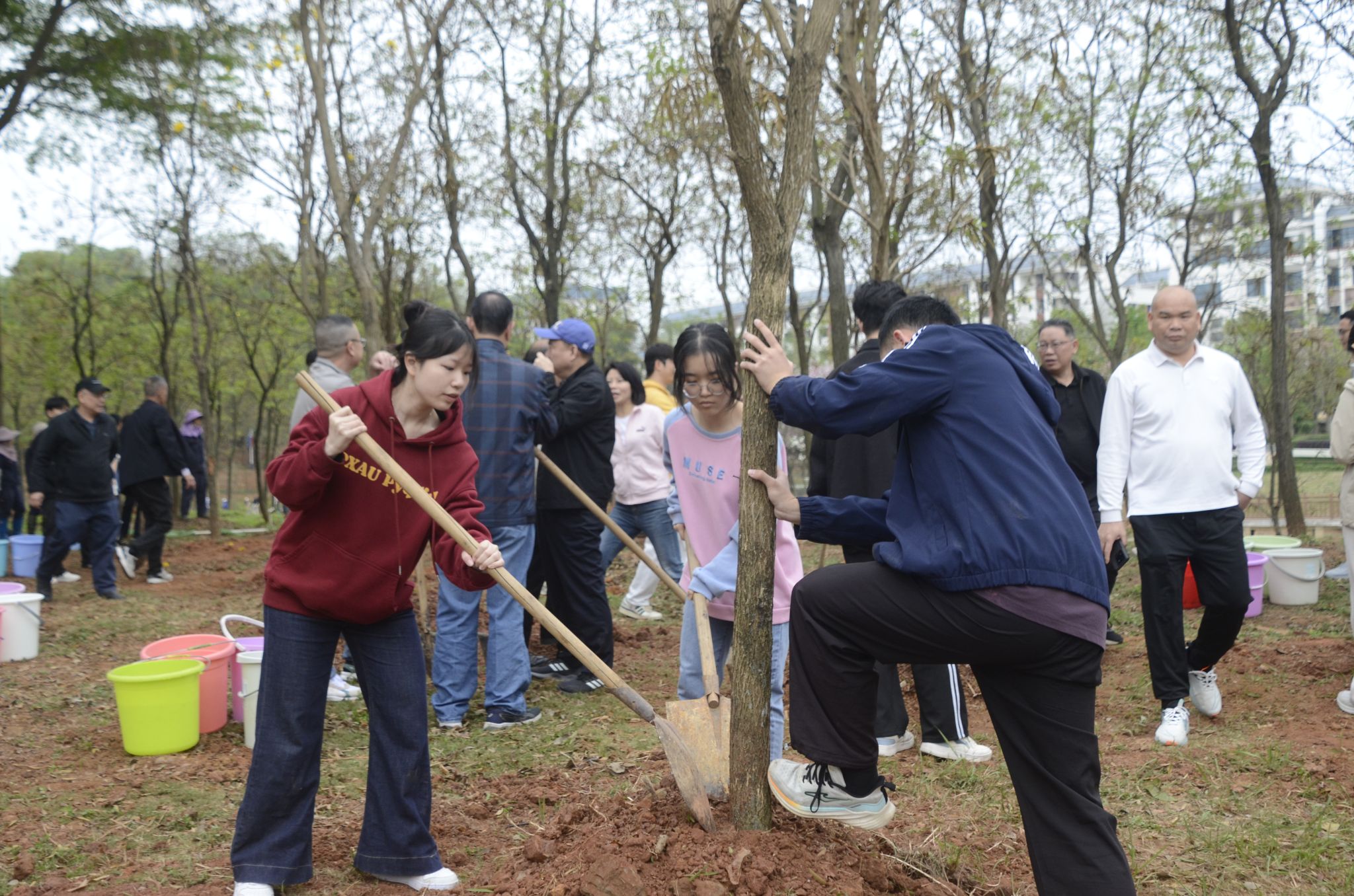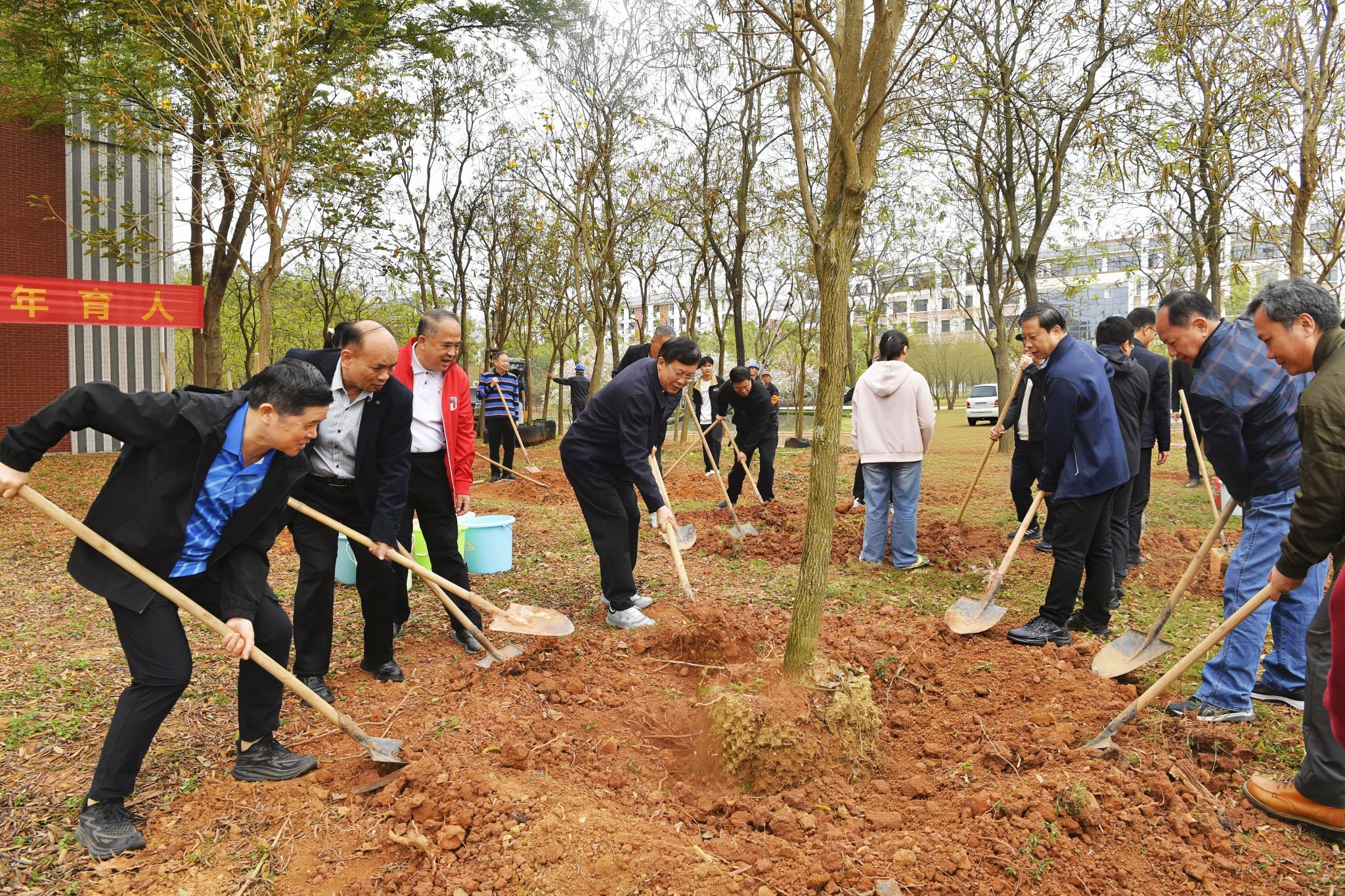 植树现场,校友和师生们分工协作、默契配合,挥锹、扶苗、培土、浇灌,细致认真地完成每个步骤。经过一番辛勤劳动,大家合力种下74棵黄花风铃木,为春日民大再添新绿。