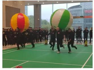 2.运转乾坤:每队6人,将运转乾坤大球举至头顶,从起点开始,绕过标志物后,最先回到起点的队伍为胜者。