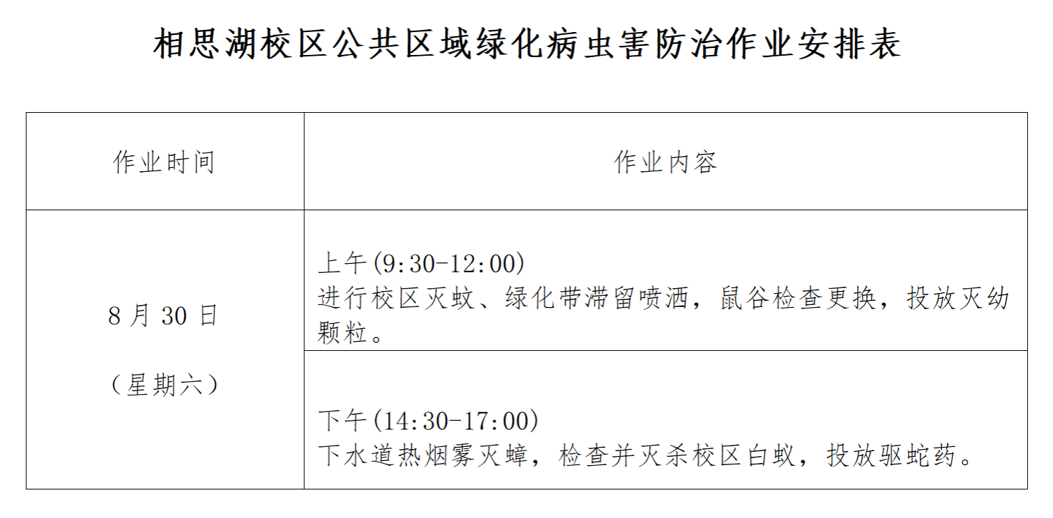 为做好校园公共区域绿化病虫害防治工作,有效保护校园生态环境,华保盛物业将于2025年8月30日(周六)对相思湖校区道路两侧的树木、绿化带及下水道、污水井,老鼠屋,树木开展病虫害防治、灭蚊消杀作业(详见附件)。