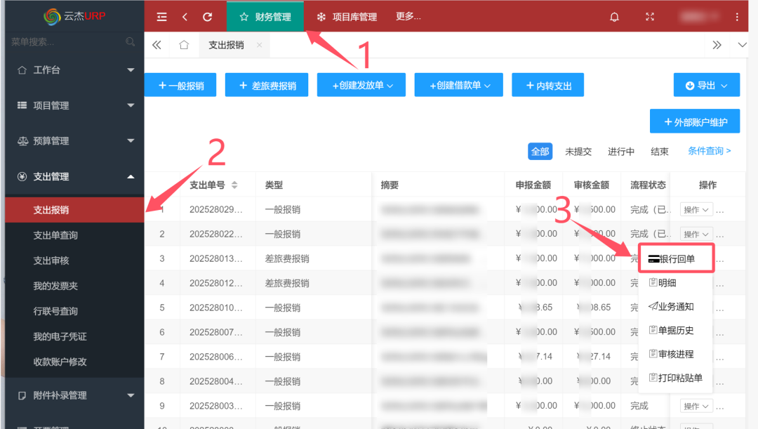 登录数智财务平台,进入“财务管理”,选择“支出报销”模块,找到需要下载回单的支出单号,点击“操作—银行回单”。