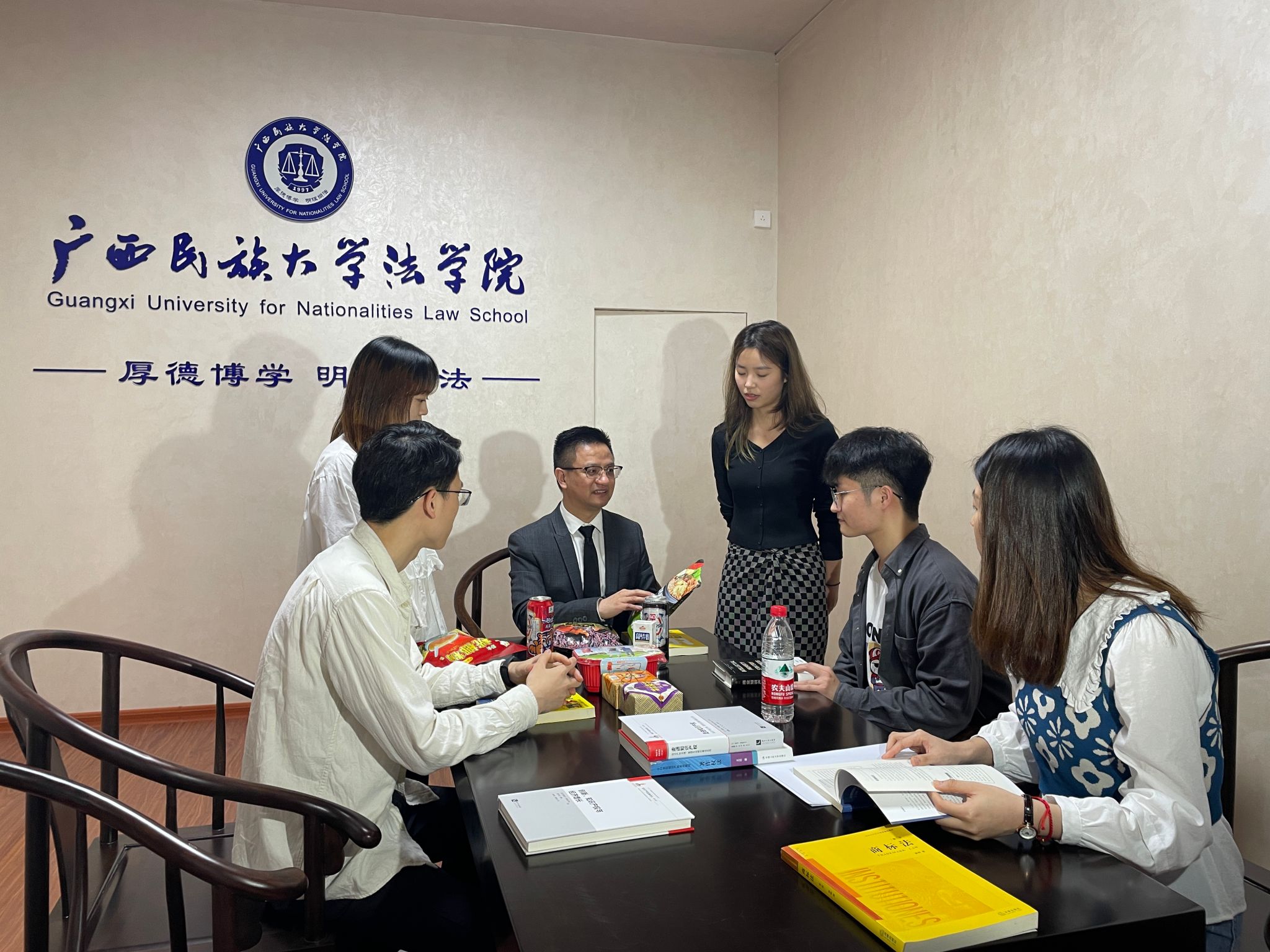 课堂上,同学们桌前摆着各样的“品牌”零食,“粤利粤”饼干、“治治”香瓜子、“王老正”凉茶……这是在商标法课中,陈星主动提供经费,让学生前往市场买回一些“名牌产品”。上课与学生上网寻找资料,查询每件零食品牌是否已注册商标,商标是否侵权。经查验,绝大多数零食均为假冒商标的“山寨货”。“问题解决,零食你们可以分享掉了。”“吃了这些不会中毒吧?”一个学生调侃性的回应惹得众人大笑不止,课堂气氛十分活跃。