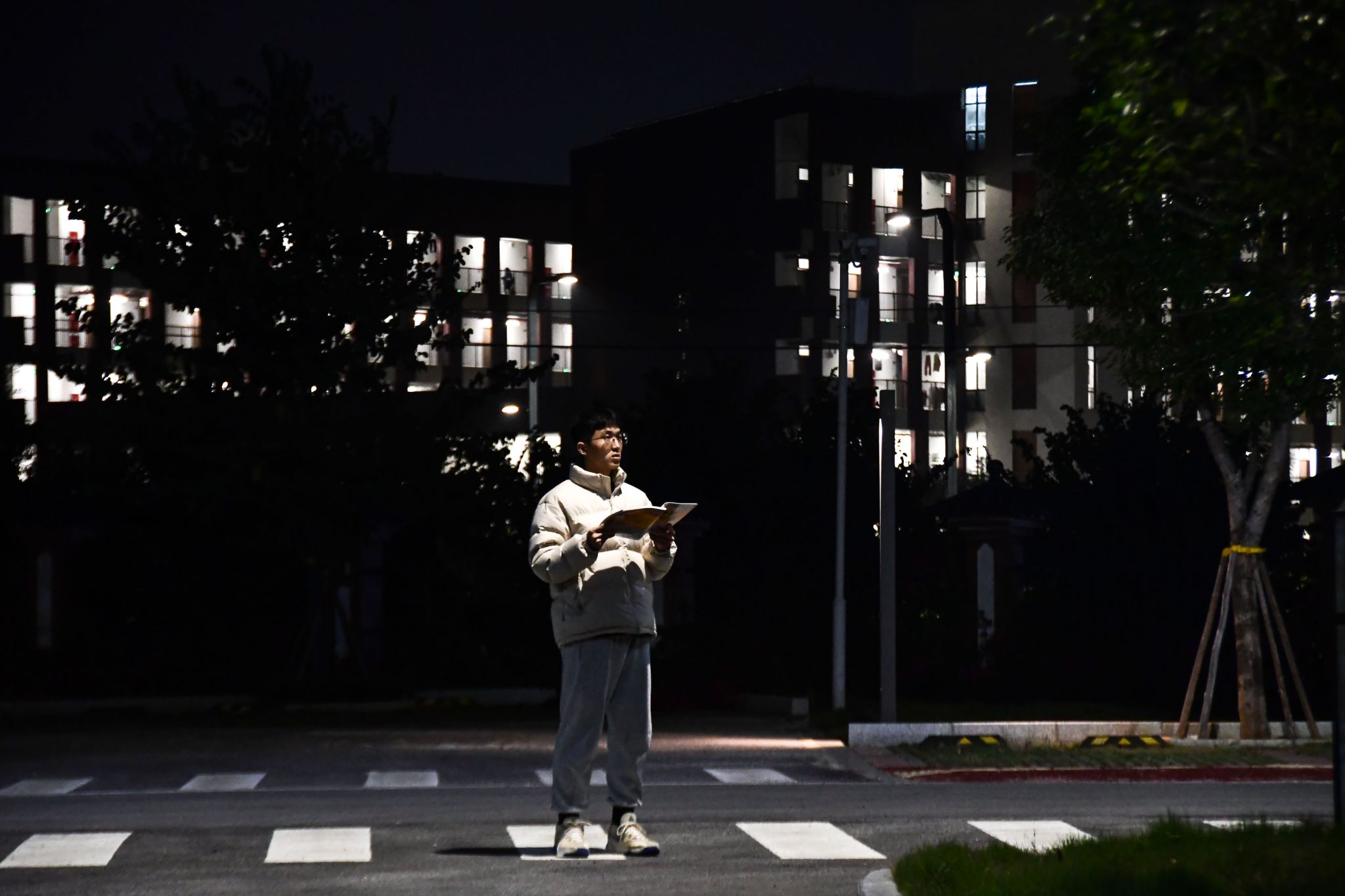 考研人夜晚路灯下背书