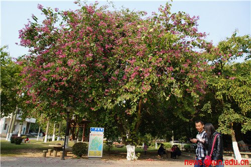 【大学生通讯社报道】南方的冬天,没有凛冽寒风的摧残,民大校园里绿树红花依旧。一树红花,映衬着民大人饱满的热情;寒风吹拂,相思湖面微波荡漾,不失春意;阳光洒下的金黄,点缀在绿树红花间,校园里的冬景依然充满生气。(编辑:黄子芸 校对:黄怀敏)