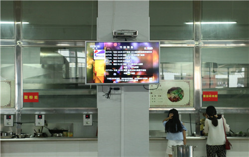 食堂的墙面、柱子上,几台电视正在播放着关于体坛的新闻,为来这里的师生提供视觉服务,让就餐生活添加一抹亮色。