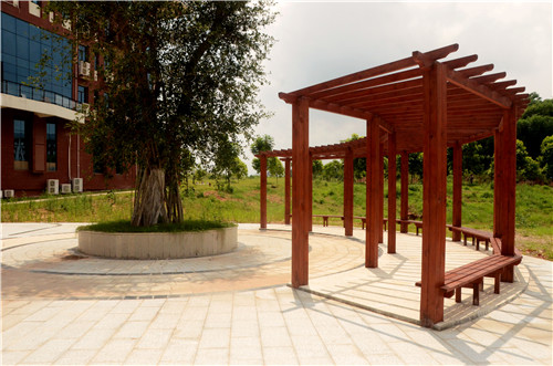 一处新建成的小广场,低调地隐藏于艺馨楼正后方。它的橙红之色,与音乐厅、艺馨大楼相互融合。它面朝相思湖,与练声的学子一起,迎着朝阳“盛放”在湖堤一畔。