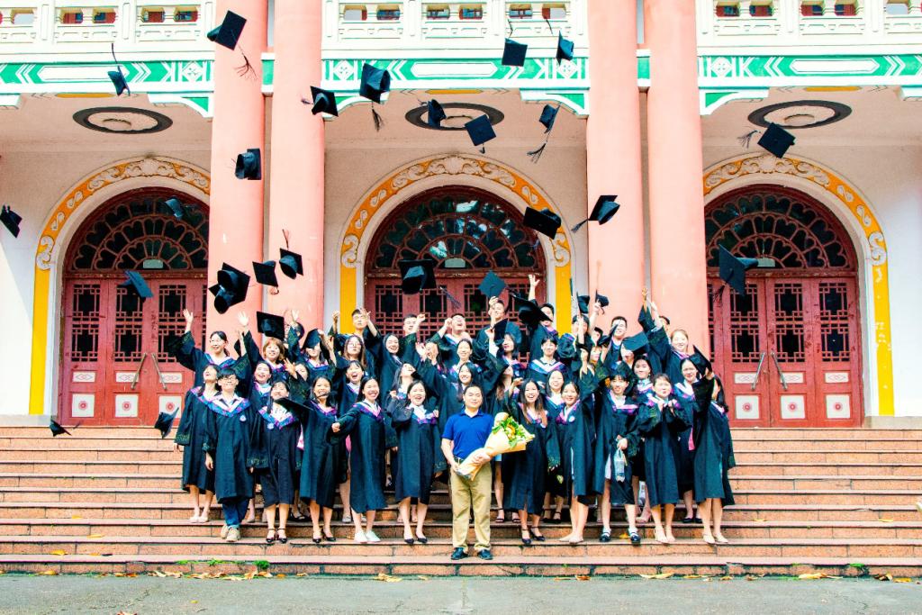 即将离校,在学校大礼堂放飞学士帽,预示未来展翅高飞。