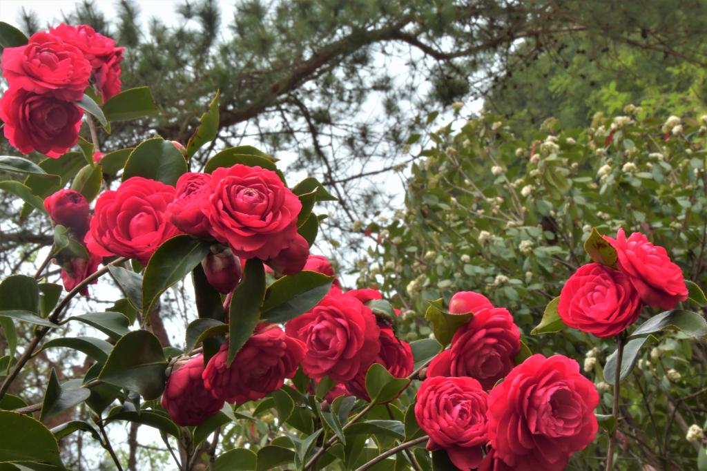 在清新恬淡的花丛中,艳丽的山茶花显得格外耀眼,让人不禁想起那句“似有浓妆出绛纱,行光一道映朝霞”。