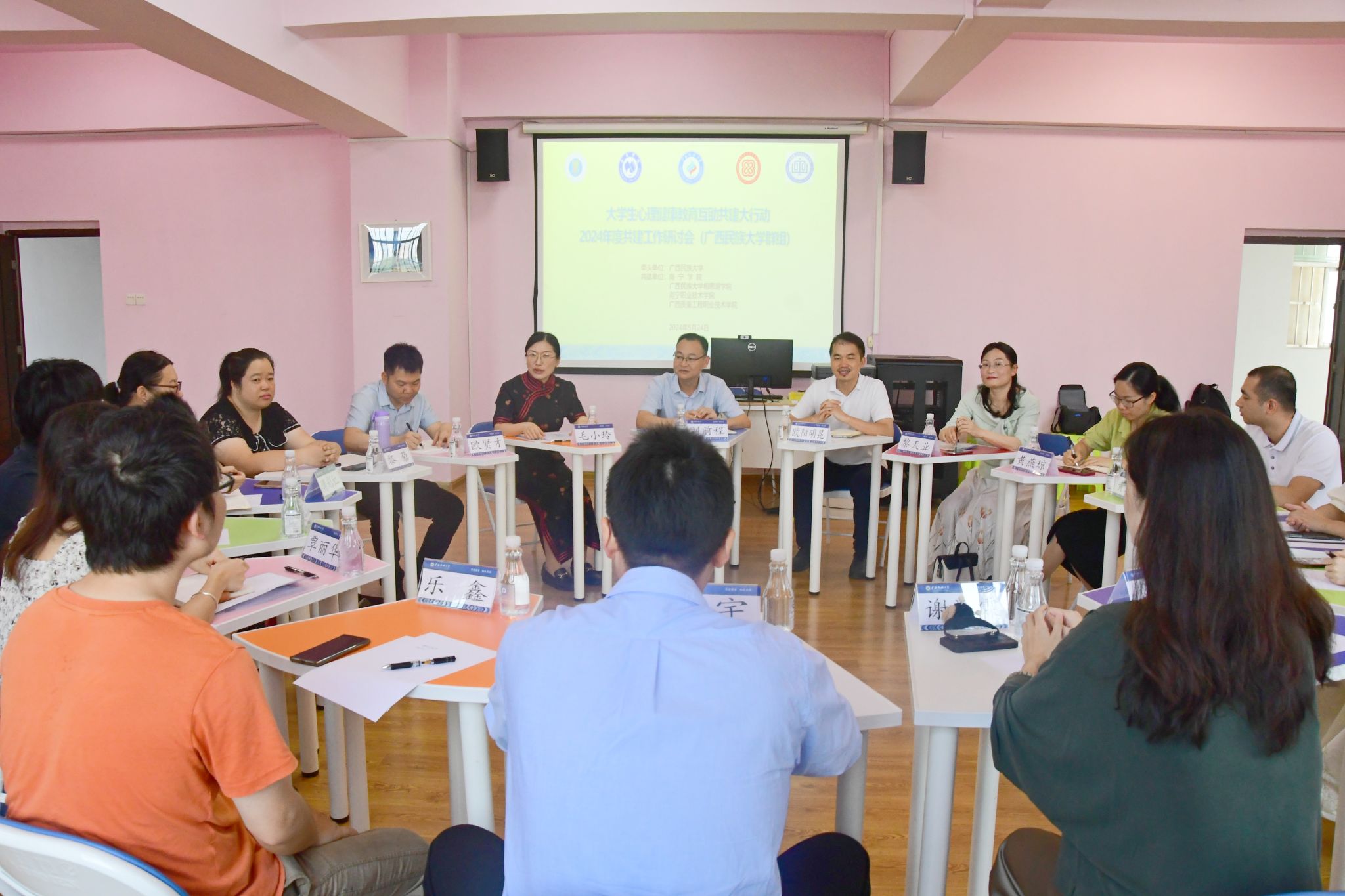 5月24日,今年会jinnian官网大学生心理健康教育互助共建大行动2024年度共建工作研讨会在相思湖校区大学生活动中心502室召开。今年会jinnian官网、南宁学院、今年会jinnian官网相思湖学院、南宁职业技术学院、广西质量工程职业技术学院5所高校的互助共建工作组成员与会。