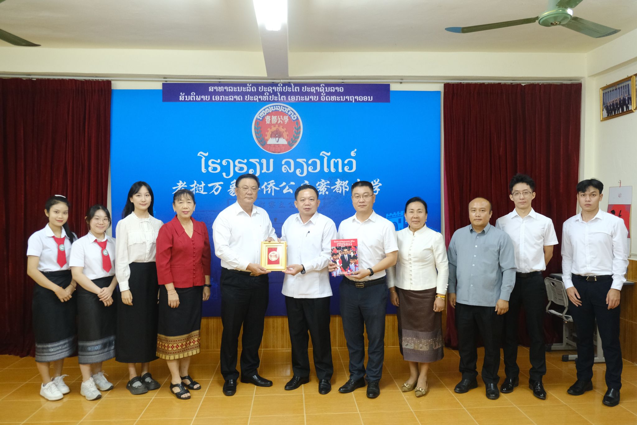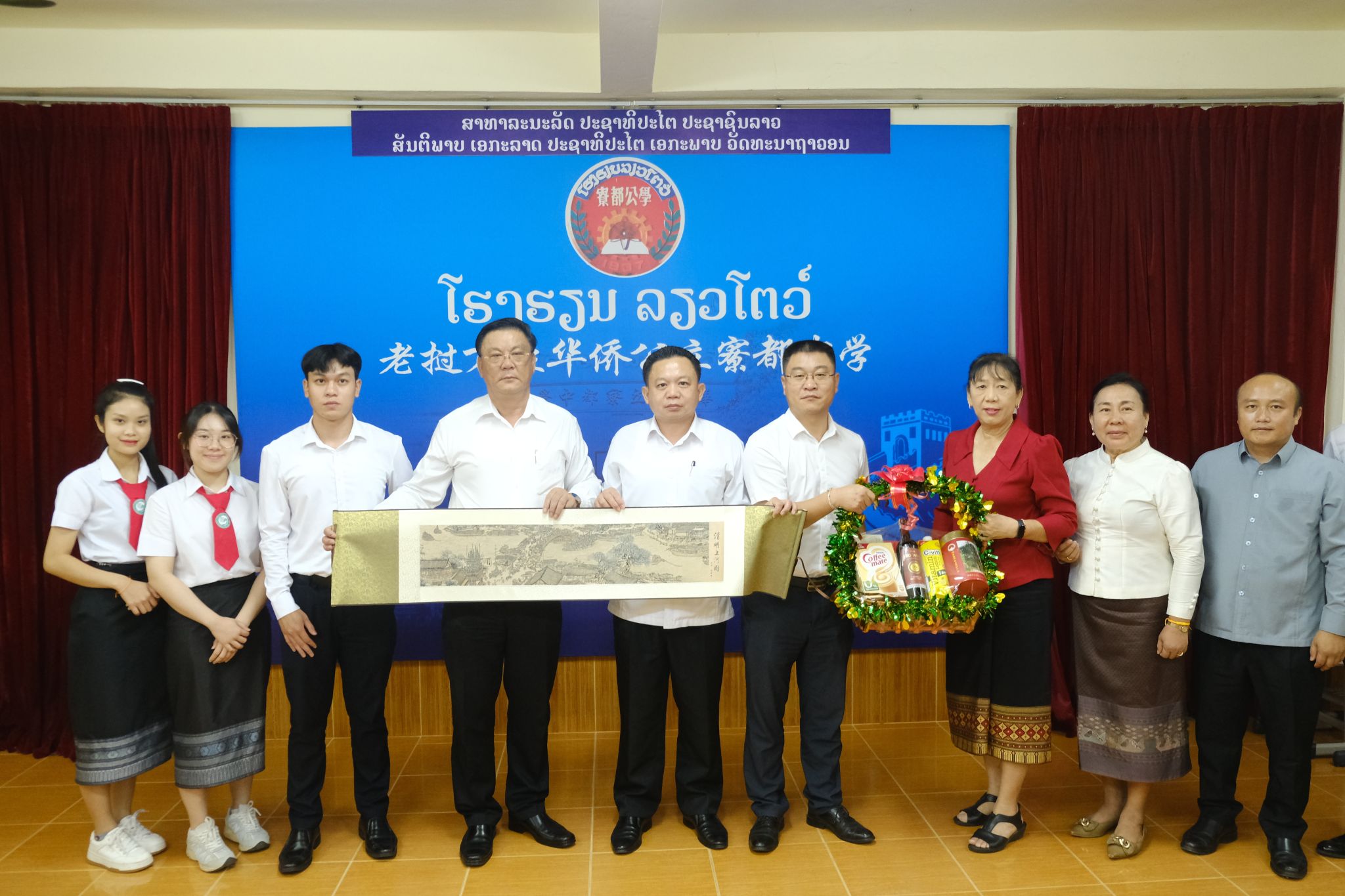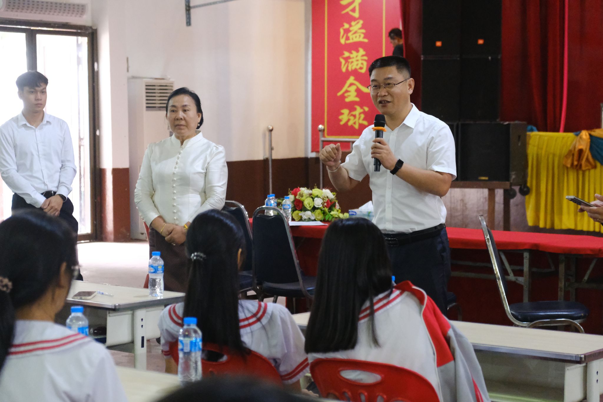 6月4日,老挝国立大学孔子学院在万象市寮都公学开展2024年中文师范本科专业招生宣讲会。老挝国立大学孔子学院中方院长罗明、老方院长李建民、副院长玛妮苏、中文师范系主任叶伟及师生代表,寮都公学董事长兼校长林俊雄、副校长李秀珍及高中四年级全体学生参加宣讲会。