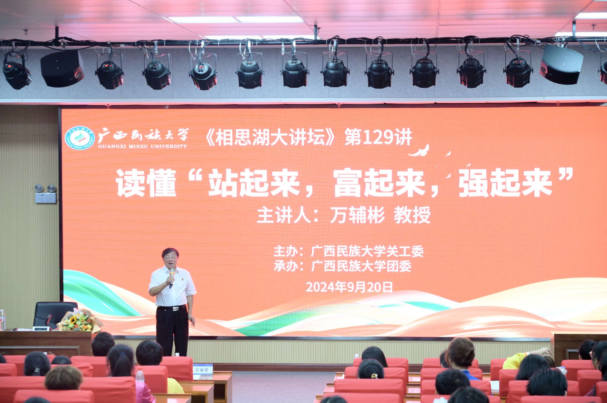 【大学生通讯社报道】9月20日下午,“相思湖大讲坛”第129期——“读懂‘站起来,富起来,强起来’”主题讲座在相思湖校区图书馆13楼学术报告厅举行。讲座由学校关工委副主任万辅彬教授主讲。学校关工委、校团委、广西学联代表及各学院师生代表参加讲座。