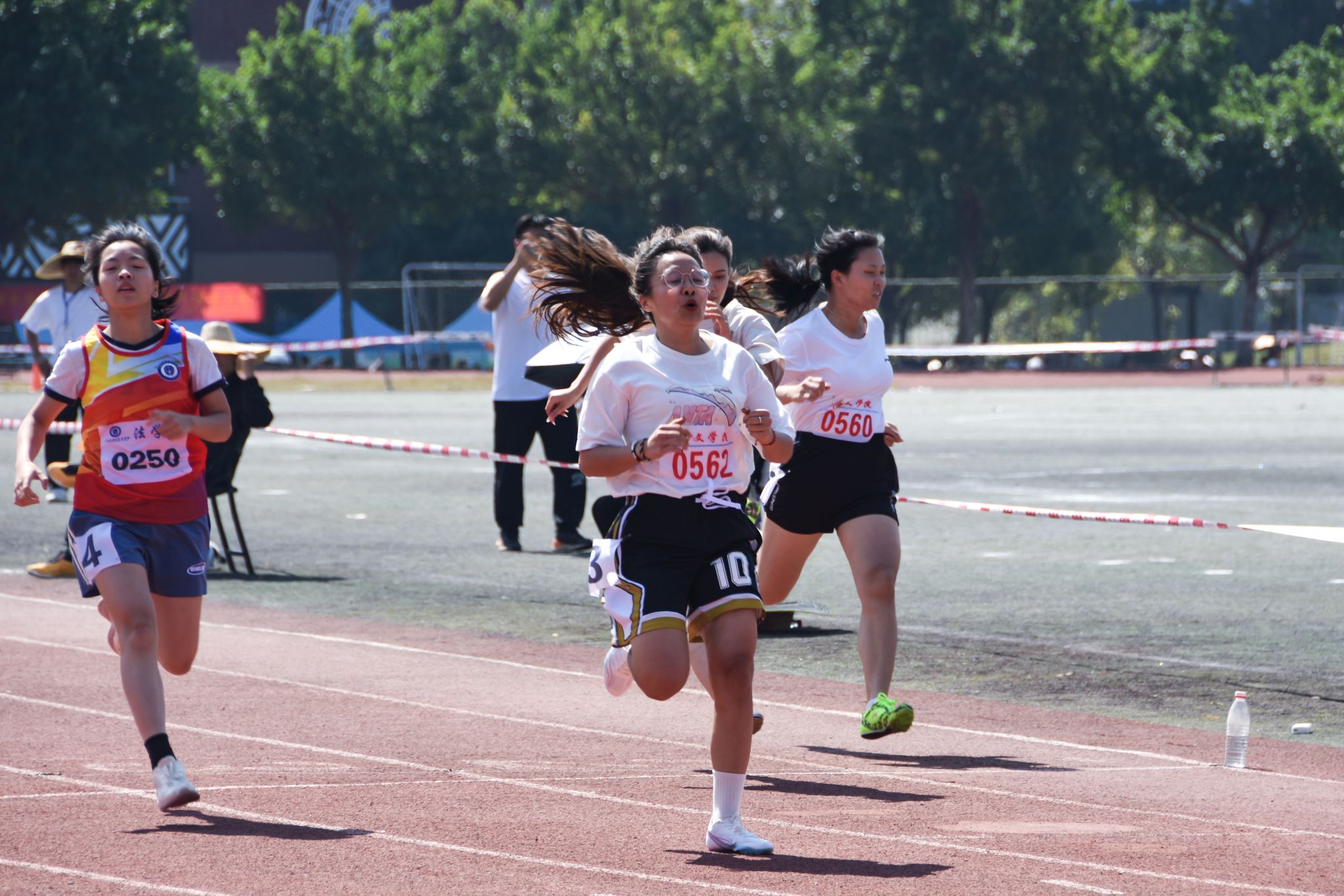 经过紧张激烈的角逐,男、女子甲组100米比赛分别有8名运动员脱颖而出,进入决赛。决赛现场气氛热烈,加油声此起彼伏,百米决赛在一声枪响中成为全场焦点。