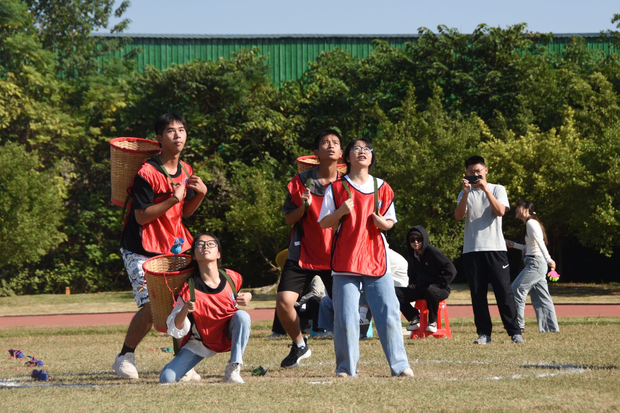 比赛现场,选手们全神贯注地注视着在空中飞舞的绣球。投球手手臂轻扬,将绣球抛出,背篓手紧盯绣球,看准时机调整肩带,平稳快速地接球。政治与公共管理学院配合默契,“低一点,不要太高。”“好球,偏一点。”队员之间互相提醒,控制着比赛节奏。投球手动作迅速整齐,背篓手灵活地调整队形,队员们渐入佳境,掉落地上的绣球屈指可数,落入背篓中的绣球越来越多。