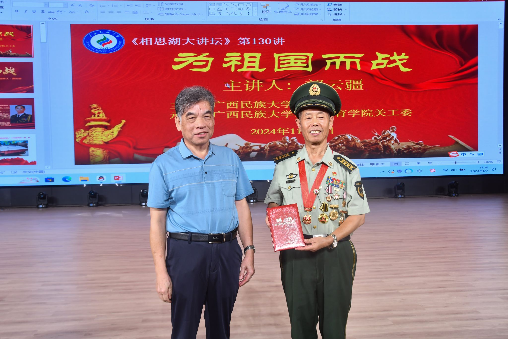 【大学生通讯社报道】11月7日下午,广西关工委“军休五老”宣讲团宣讲员、南宁市军休中心军休干部郭云疆到我校武鸣校区图书馆报告厅作“为祖国而战”专题报告。学校关工委副主任杨再延,关工委秘书长梁淑芳及预科教育学院师生代表1000余人到场参加。