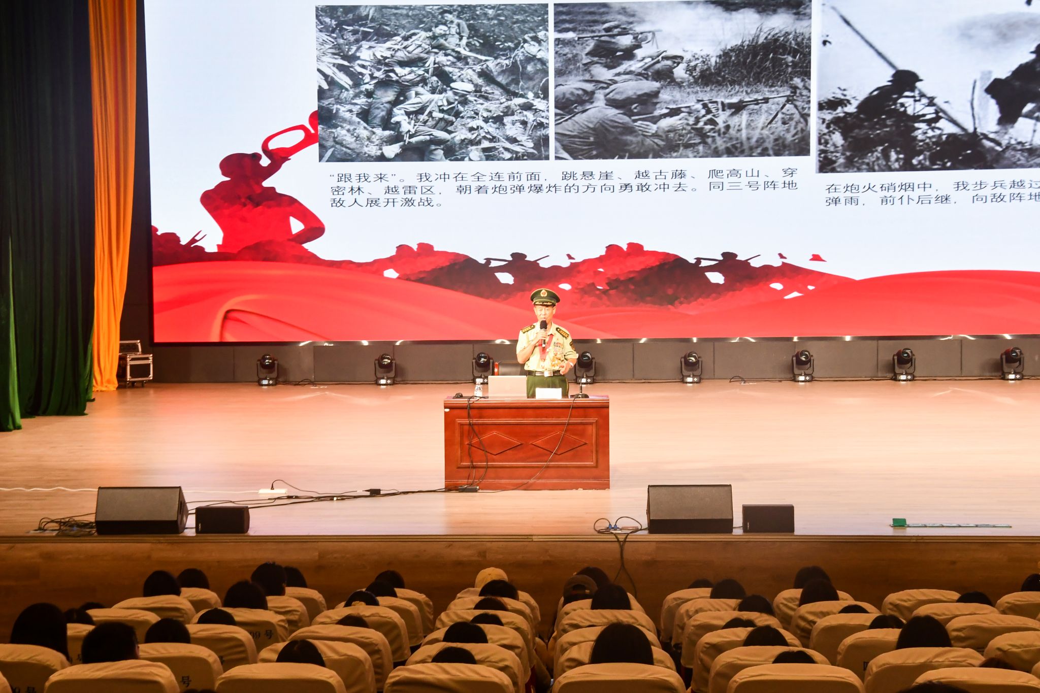 郭云疆分享军旅生涯经历,讲述亲身经历的战斗故事。他回忆当年的战争画面,以自己和战友之间的情谊为线索,讲述了战士们在战场上浴血奋战、不怕牺牲的故事,表达了战士们用生命和鲜血保卫祖国、保卫人民的崇高爱国精神。他希望同学们通过生动而真实的战争故事,了解到战场的残酷与无情,感受到军人的伟大与勇敢,体会到如今美好生活的来之不易。