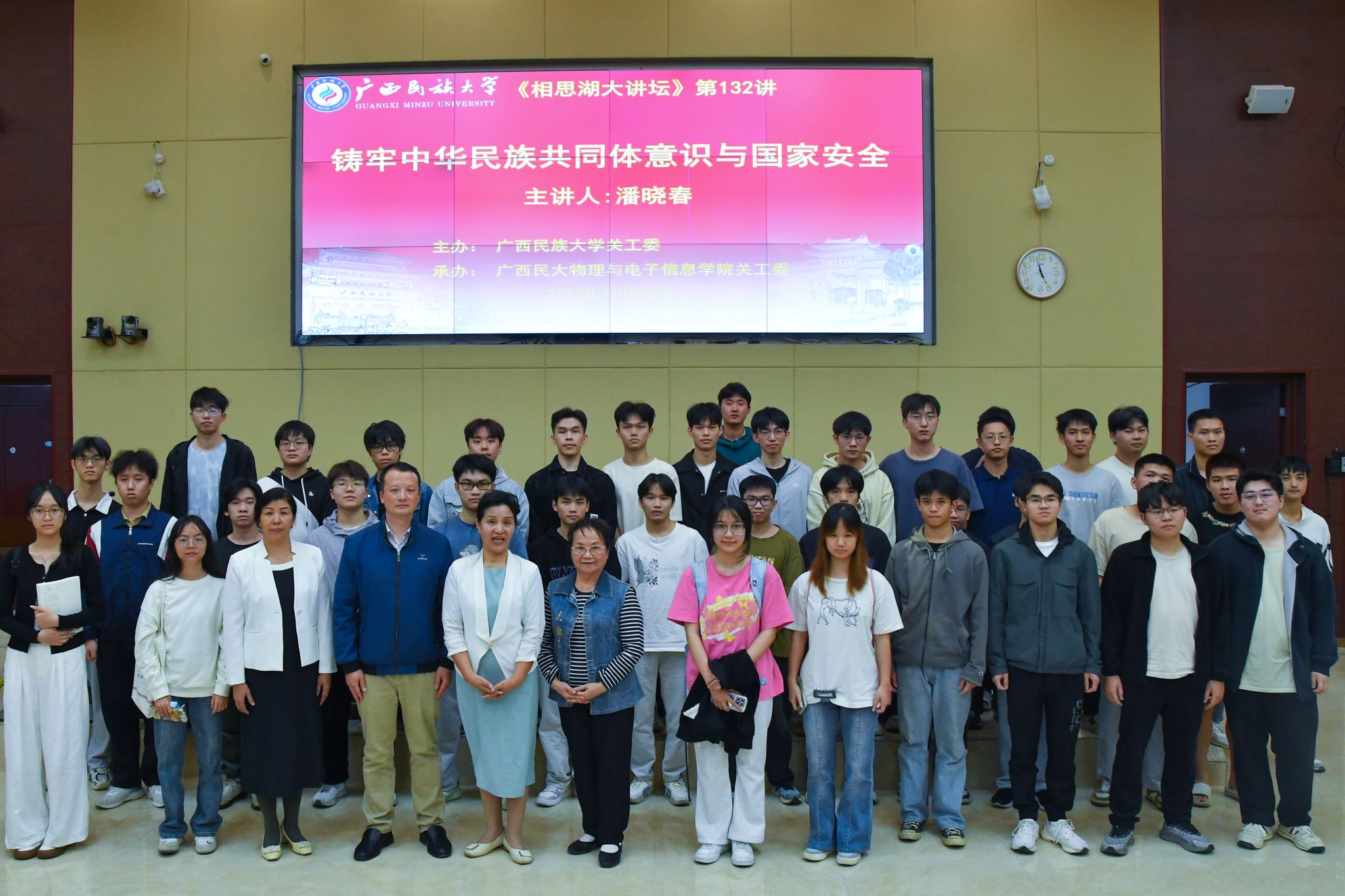 【大学生通讯社报道】11月26日下午,“相思湖大讲坛”第132期——“铸牢中华民族共同体意识与国家安全”专题讲座在创新楼报告厅举行,自治区党委党校退休教授、今年会jinnian官网“学生社会课堂导师”潘晓春主讲。学校关心下一代工作委员会、物理与电子信息学院有关领导和师生代表参加讲座。