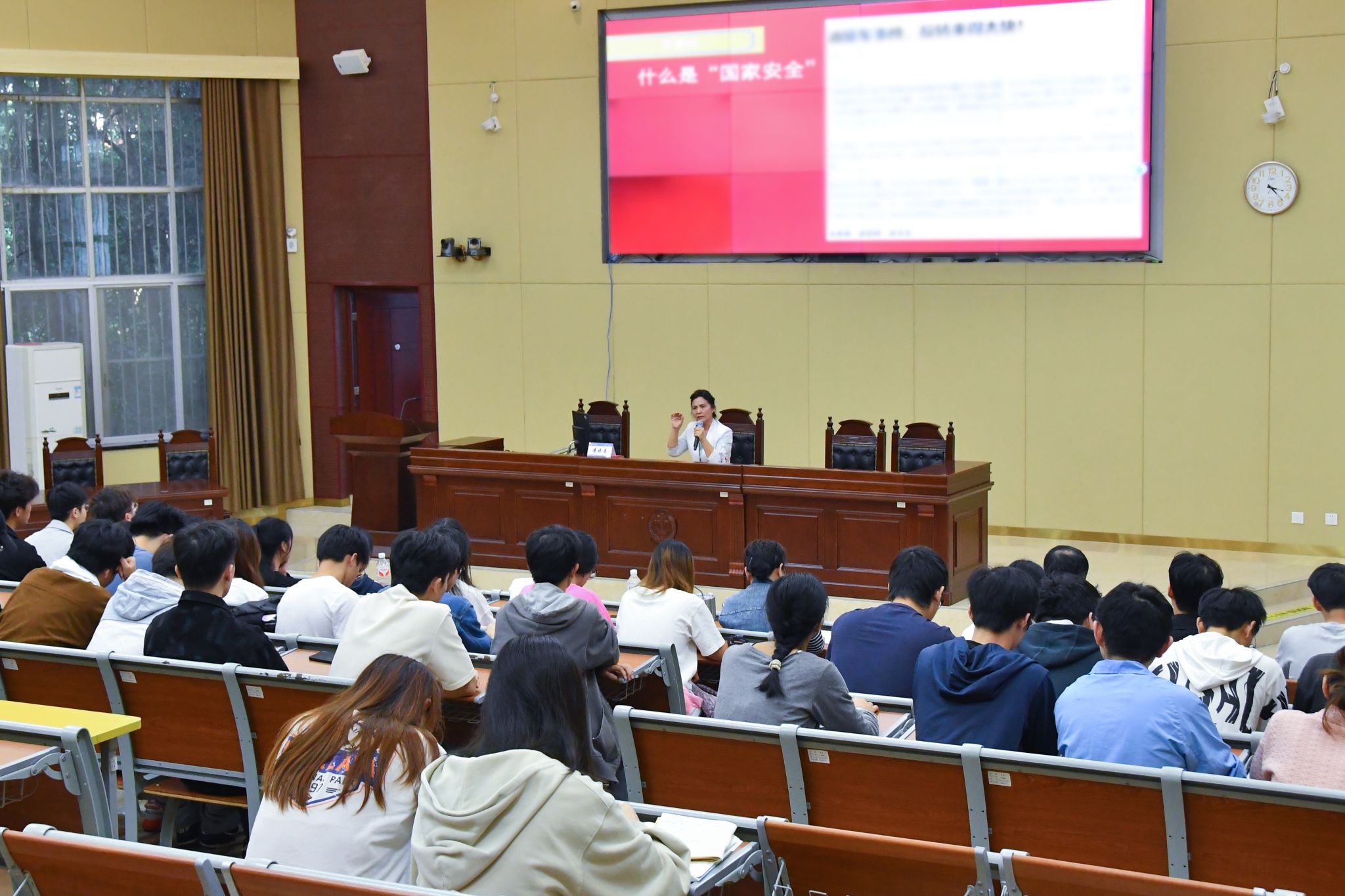 结合本次讲座主题和情景教学中的案例分析,潘晓春向现场观众提出问题并对同学们的回答进行点评。潘晓春表示,国家安全是国家生存发展的基本前提,维护国家安全是全国各族人民根本利益所在,当代大学生要铸牢中华民族共同体意识,团结各族人民,为实现中华民族伟大复兴贡献青春力量。