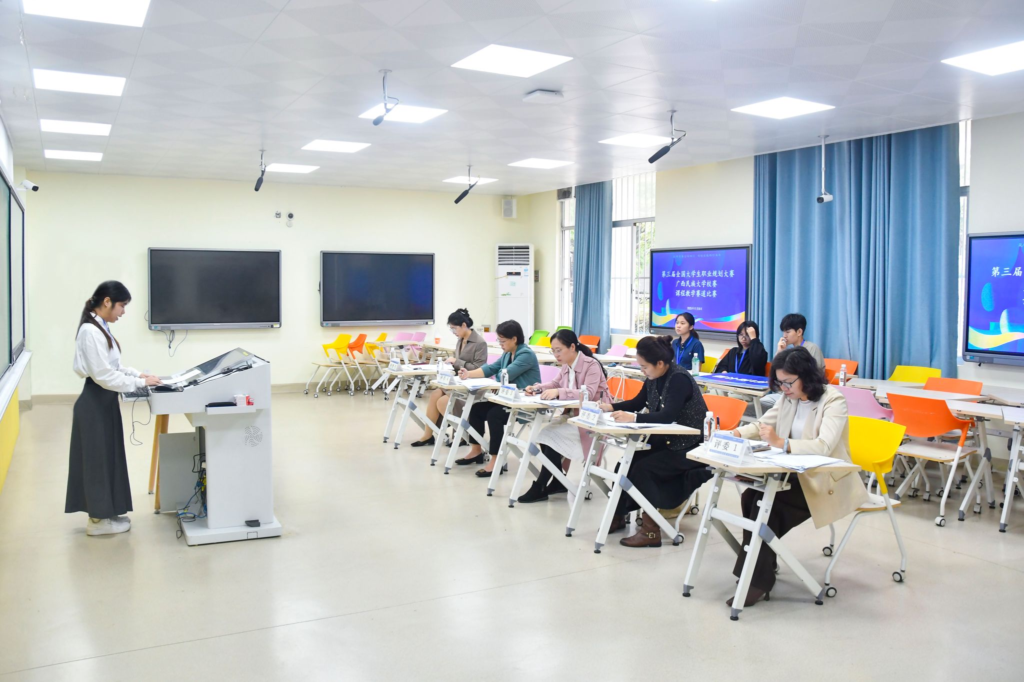 本次比赛以“筑梦青春志在四方,规划启航职引未来”为主题,邀请学校社会科学处、马克思主义学院、民族学与社会学学院、教育科学学院、建筑工程学院等有关单位及学院专家担任评委,设置课程建设汇报、无生教学展示和互动答辩三个环节,全面考察教师在大学生职业发展与就业指导课程中的教学水平与专业素养。比赛不仅促进课程教学改革创新,也进一步推动落实立德树人根本任务,助力学生实现更加充分、更高质量的就业。(初审:肖耀科 编辑:韦丽娜 复审:韦利坤 终审:孙寿媚)