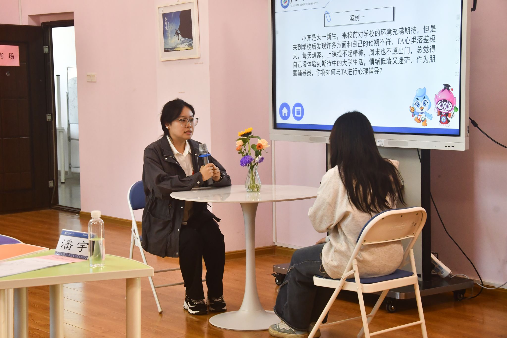 参赛选手通过情景再现的方式,围绕当事人的心理特征与困扰,模拟朋辈心理辅导过程。模拟辅导环节结束后,选手结合辅导实际进行简要总结,并作为主答人回答评委提出的问题,其余两名团队成员可对回答进行补充。