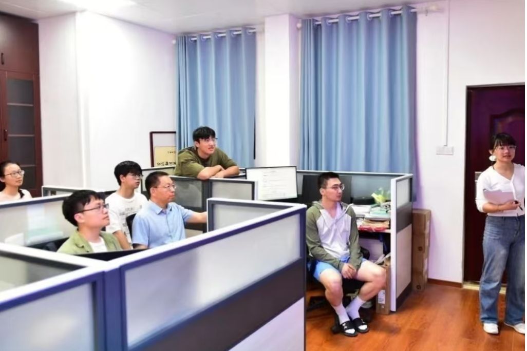 “五一”假期期间,彭自嘉和学生开组会现场