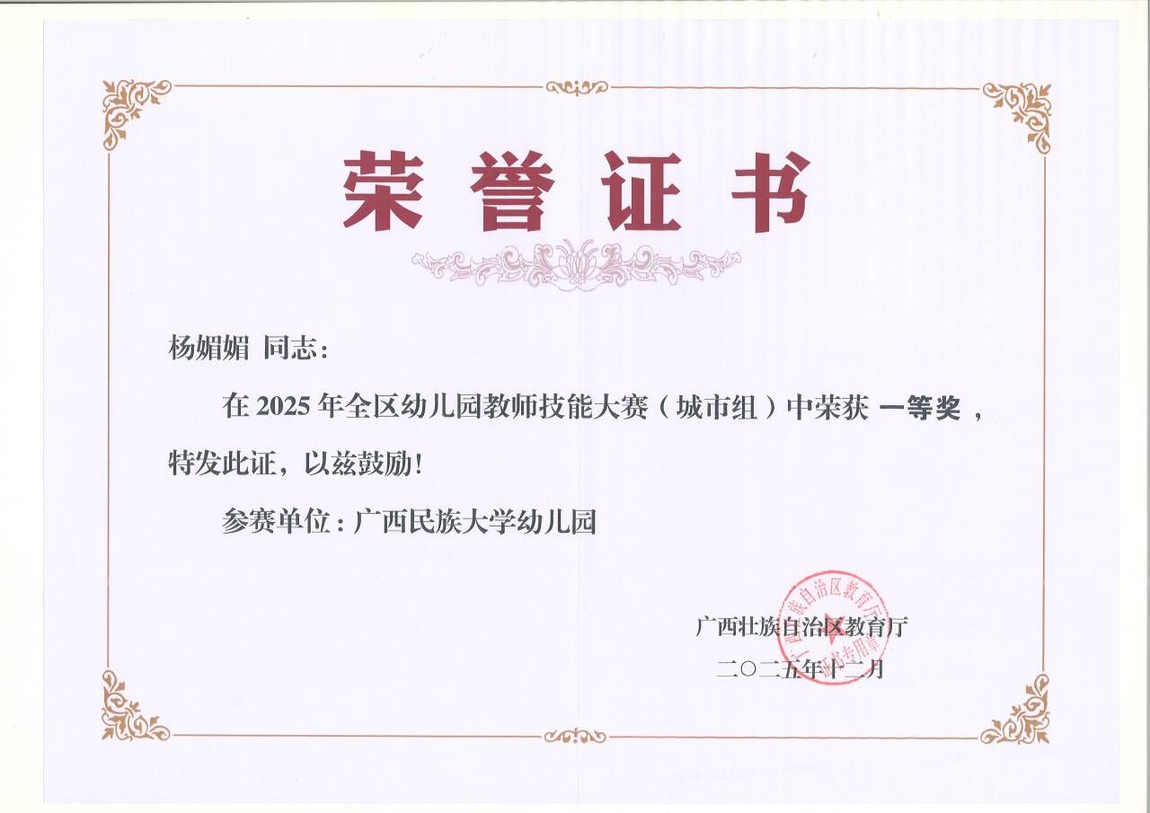 杨媚媚荣获2025年全区幼儿园教师技能大赛一等奖