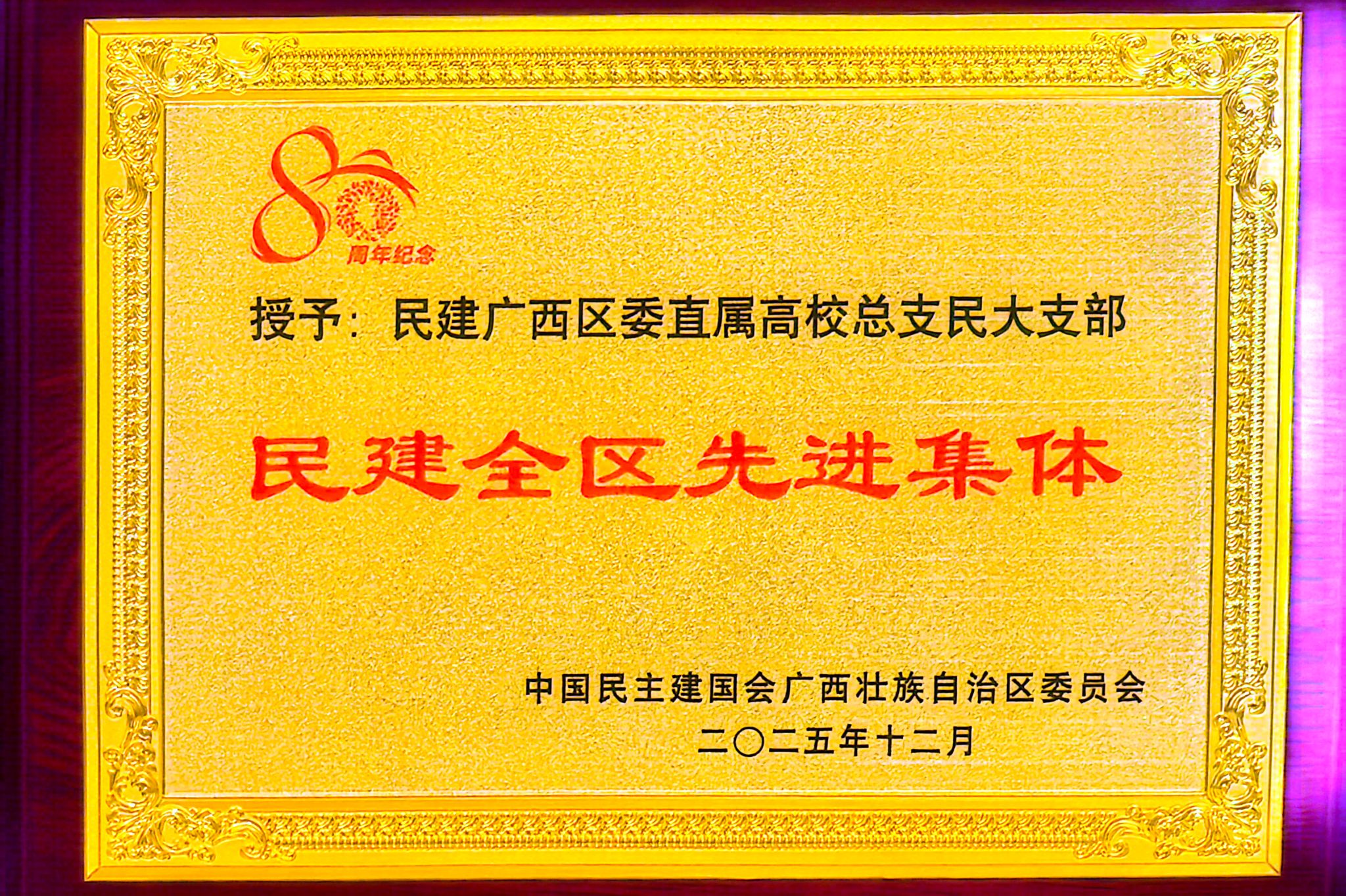 12月7日,民建广西区委庆祝中国民主建国会成立80周年大会在南宁举行。自治区政协副主席、民建广西区委主委钱学明出席并讲话。自治区政协副主席、九三学社广西区委主委彭健铭,自治区党委统战部副部长姜芳芳到会致贺词。民建广西区委直属高校总支民大支部凭借突出的工作成绩,荣获“民建全区先进集体”称号。