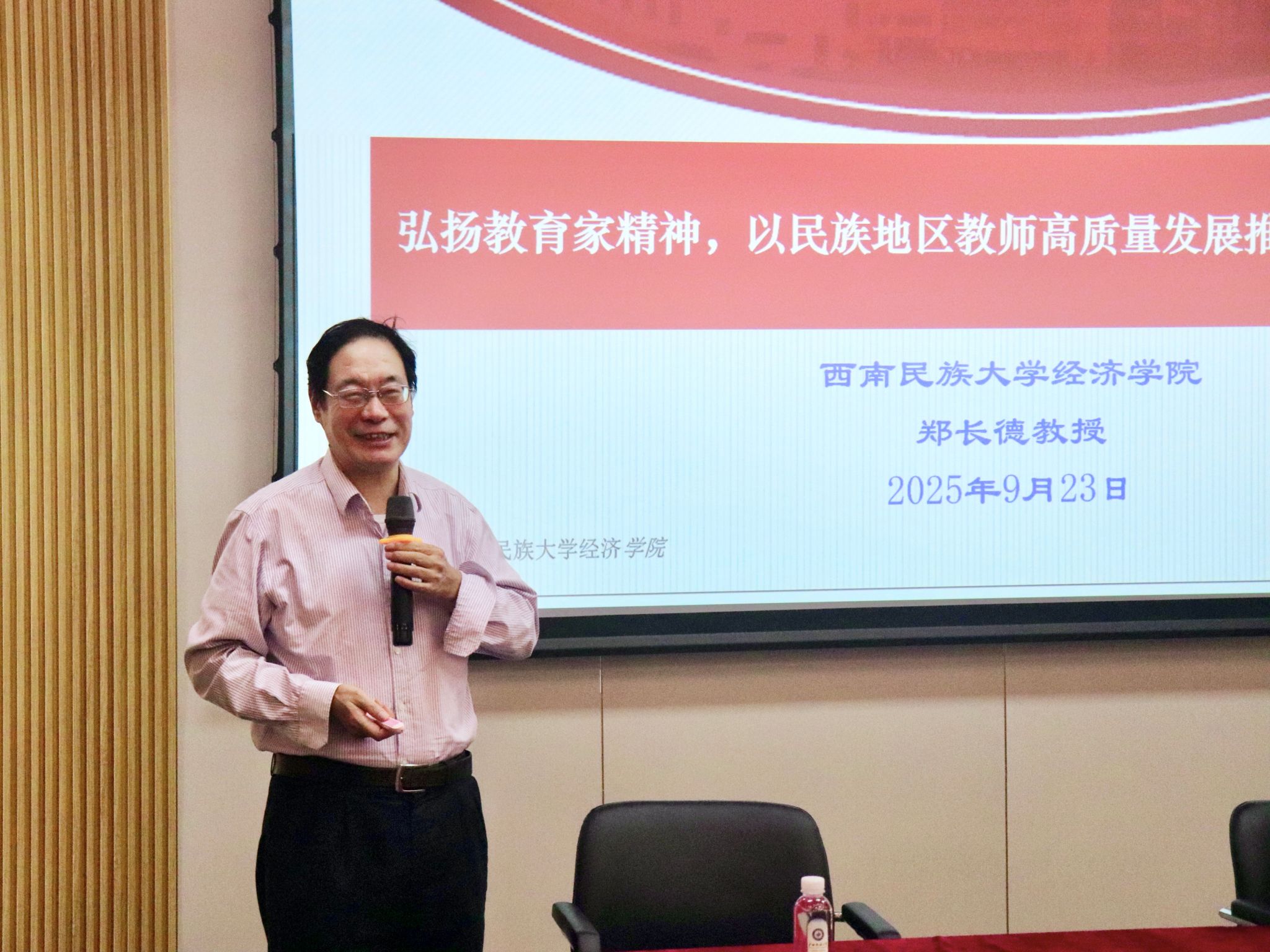 郑长德教授聚焦民族地区教师发展与队伍建设展开讲解。他表示,要提升教师培养培训质量,打造高素质专业化队伍,有效应对民族地区教育发展面临的挑战。同时,积极推动民族地区教育创新,维护教师的职业尊严与合法权益,弘扬尊师重教风尚。他强调,要以教育家精神为引领,从思想建设、师风涵养等方面发力,办好人民满意的教育。