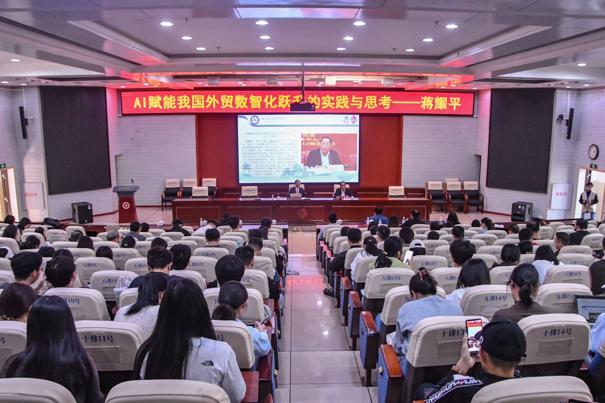 讲座提问环节,师生们围绕AI与专业融合、东盟贸易场景落地等问题踊跃提问,蒋耀平教授耐心解答,现场交流氛围浓厚。(初审:郑慧 编辑:黎倩雅 复审:韦利坤 终审:孙寿媚)