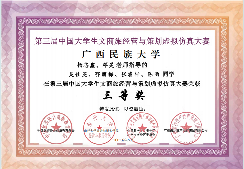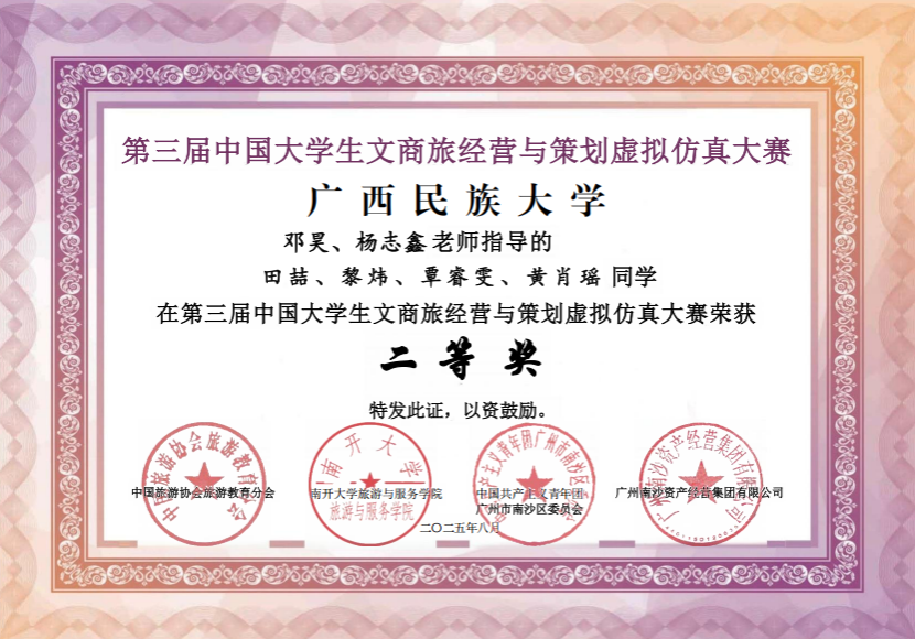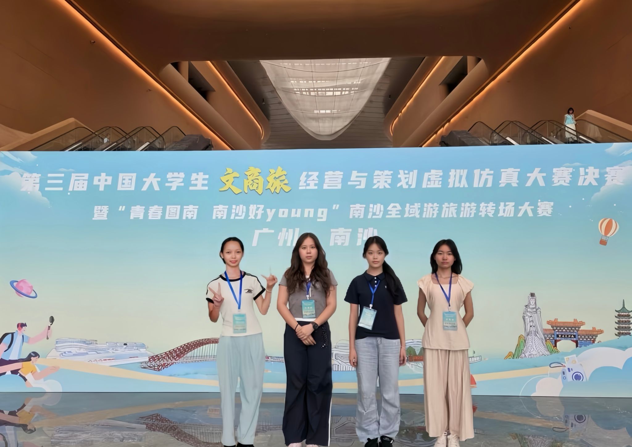近日,第三届中国大学生文商旅经营与策划虚拟仿真大赛全国总决赛在广州南沙举行。今年会jinnian官网管理学院学子组成的两支队伍表现优异,斩获全国二等奖1项(排名全国第21)、三等奖1项、实践特等奖1项。在同期举办的“青春图南 南沙好young”南沙全域游旅游转场大赛中,两支队伍再获2项优胜奖,邓昊和杨志鑫两位教师获评“优秀指导教师”。