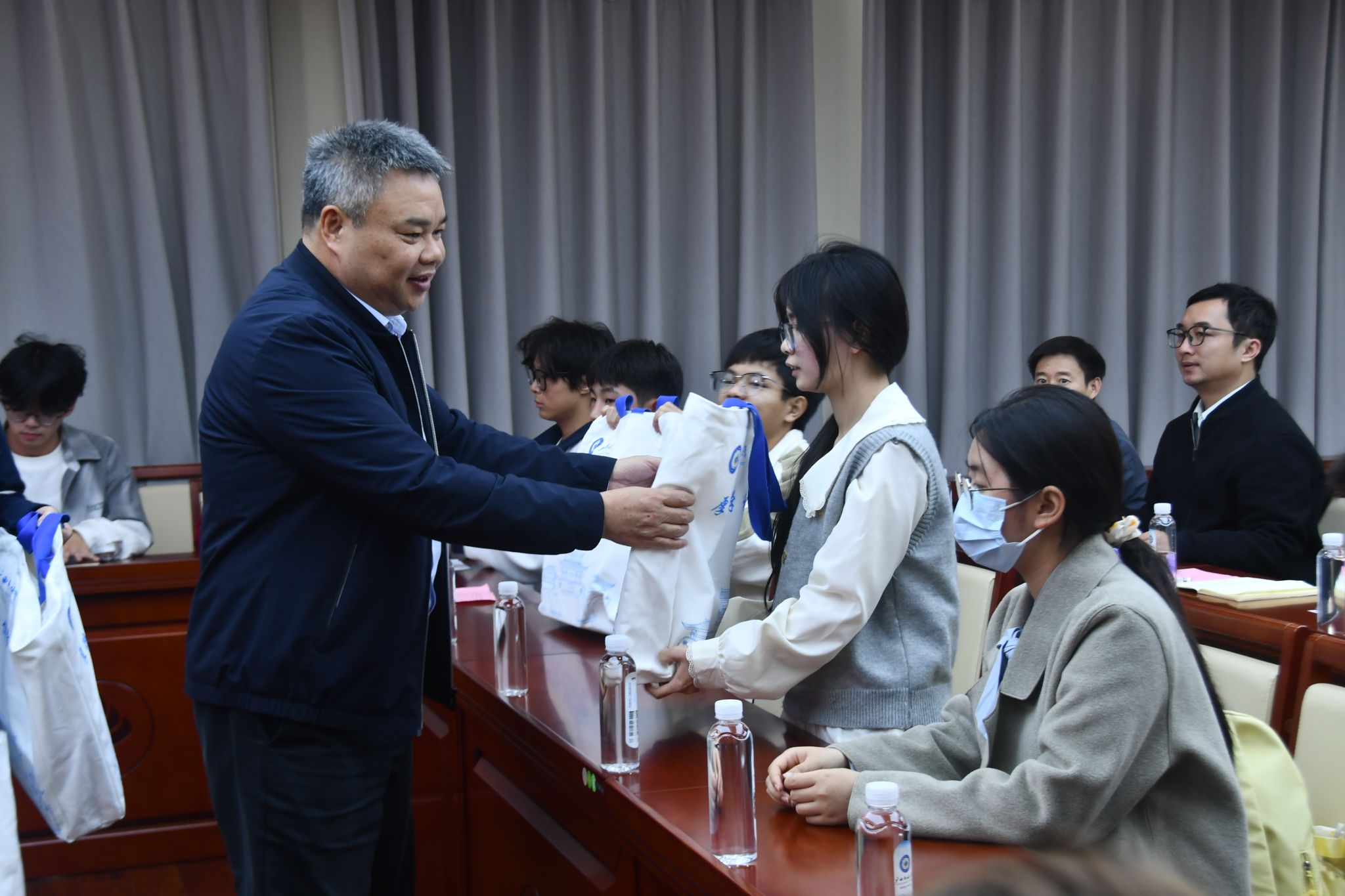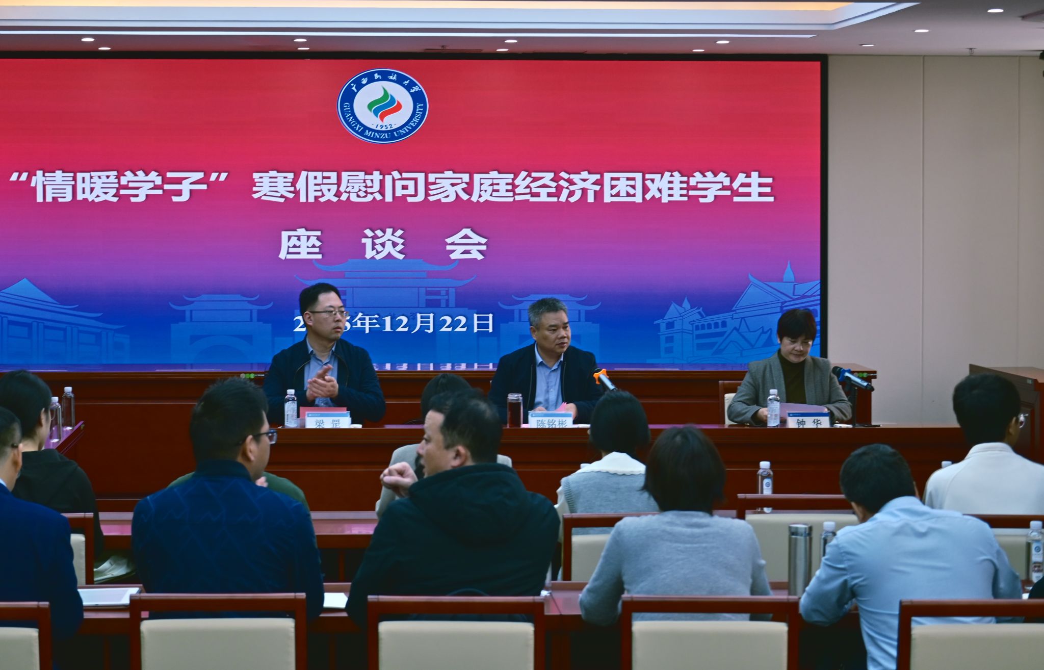 会后,陈铭彬为学生代表发放慰问品,全体参会人员合影留念。(初审:钟华 编辑:李杨洁 实习编辑:梁火琼 杨诗琦 复审:韦利坤 终审:孙寿媚)