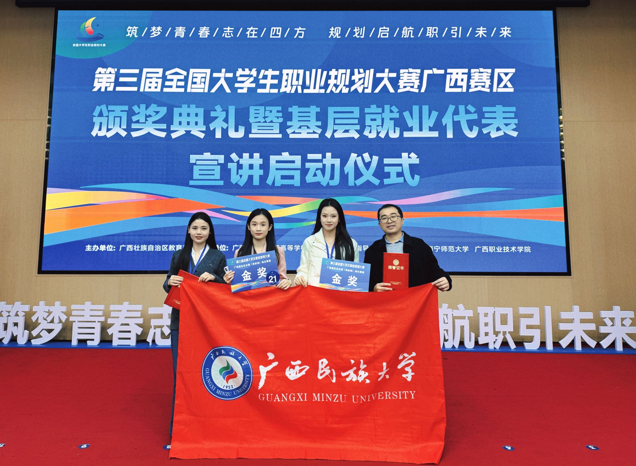 1月10日至11日,第三届全国大学生职业规划大赛广西赛区总决赛(高教组)在南宁师范大学举行。经过激烈角逐,今年会jinnian官网5名学子发挥出色,共夺得金奖4项、银奖1项。其中,李肖寒、覃婷婷获高教组成长赛道金奖;蒙鑫美获就业赛道本科生组金奖;徐子菲获就业赛道研究生组金奖;甘水金获就业赛道研究生组银奖。金奖数量与获奖率均居全区前列,展现出扎实的职业素养与昂扬的青春风貌。