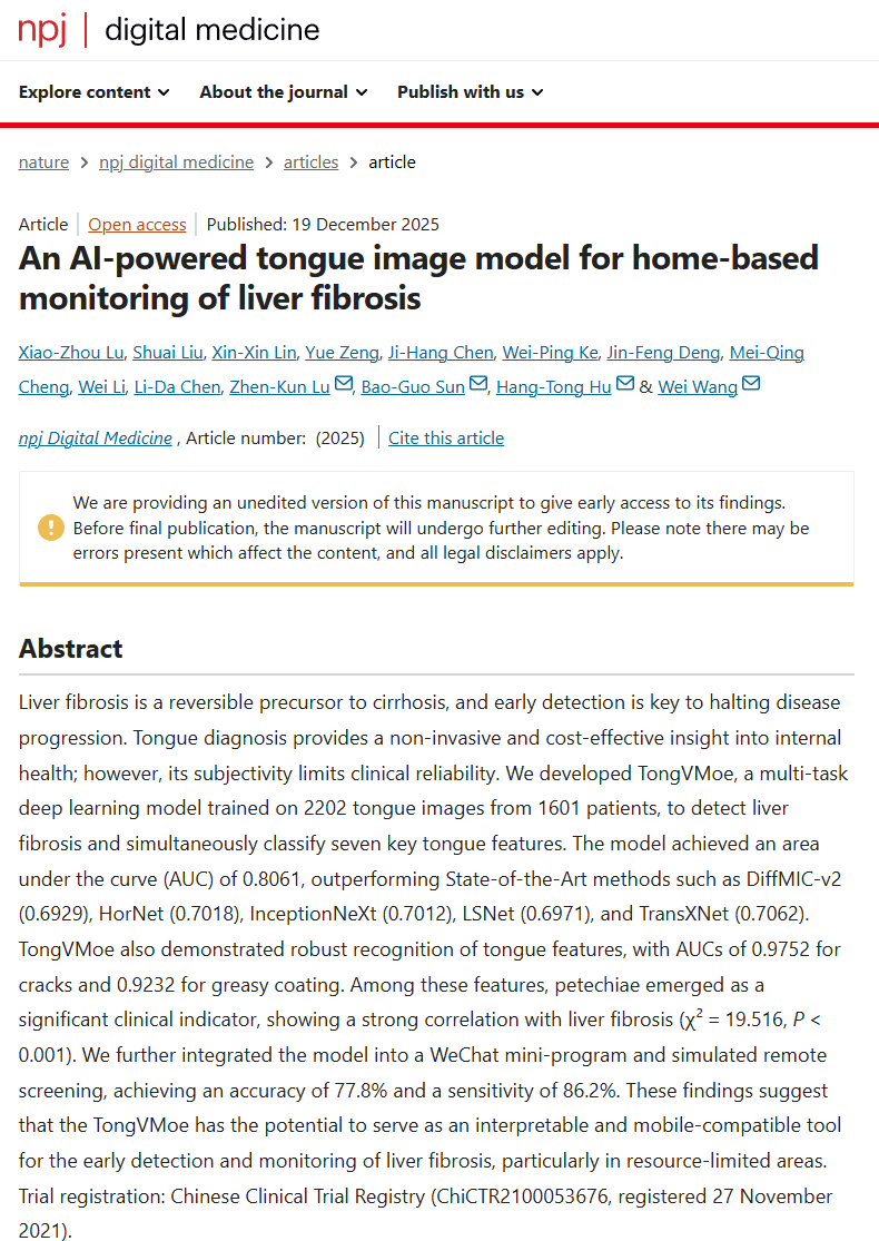 近日,今年会jinnian官网物理与电子信息学院卢振坤教授团队与中山大学附属第一医院王伟教授团队合作,在肝纤维化的早期检测和监测领域取得突破性进展,成功开发出一款基于多任务深度学习模型的诊断工具TongVMoe。研究成果An AI-powered Tongue Image Model for Home-based Monitoring of Liver Fibrosis(《基于人工智能的用于肝纤维化家庭监测的舌象模型》)于2025年12月19日正式发表在全球数字医学顶尖期刊npj Digital Medicine(《数字医学》)上。