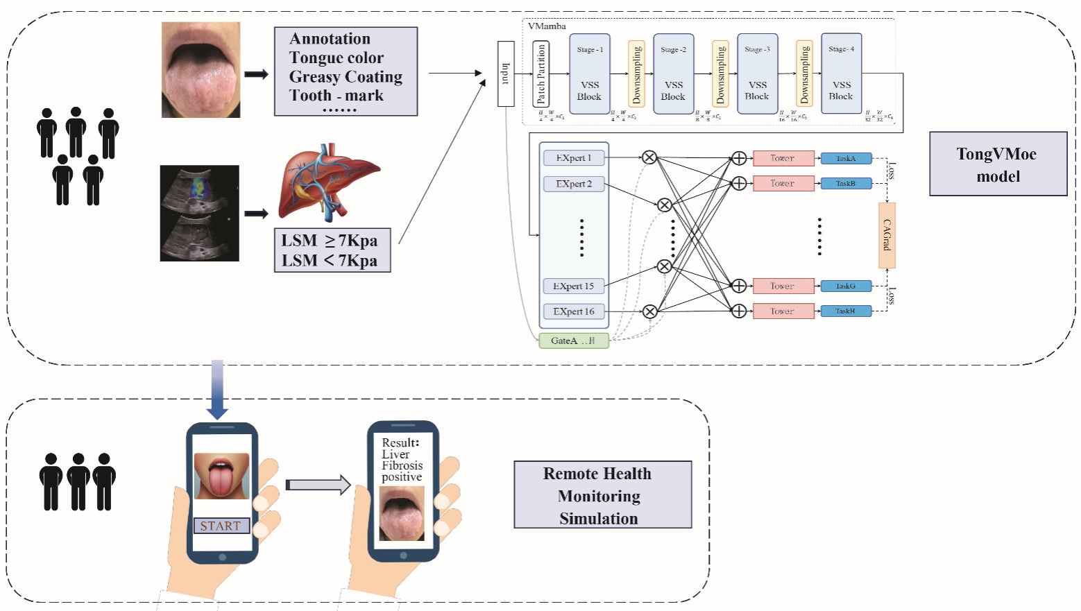 本研究指出,肝纤维化是肝硬化的可逆前兆,早期检测对于阻断疾病进展至关重要。舌诊为反映体内健康状况提供了一种无创且经济有效的手段;然而,其主观性限制了它的临床可靠性。研究团队开发了一款诊断工具TongVMoe,这是一种基于多任务深度学习模型,用于检测肝纤维化并同时对关键舌象特征进行分类。TongVMoe在舌象特征识别方面表现出稳健的性能。在这些特征中,瘀点作为一项显著的临床指标,表现出与肝纤维化的强相关性。研究团队进一步将该模型集成到微信小程序中并进行了模拟远程筛查。这些研究结果表明,TongVMoe作为一种可解释且适用于移动端的工具,有望用于肝纤维化的早期检测和监测,尤其在医疗资源匮乏的地区具有应用潜力。