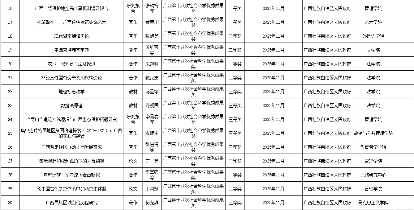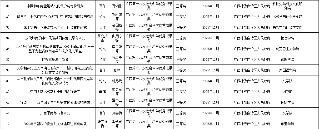 广西社会科学优秀成果奖是广西社科领域的最高荣誉,代表广西哲学社会科学研究的最高水平。学校将进一步巩固优势学科、培育特色方向、激发科研潜能,持续提升科研创新能力与成果转化质效,推动学校哲学社会科学研究迈向新高度、实现新跨越,为奋力谱写中国式现代化广西篇章贡献更多优质学术成果与智力支持。(初审:滕兰花 编辑:韦丽娜 复审:韦利坤 终审:孙寿媚)