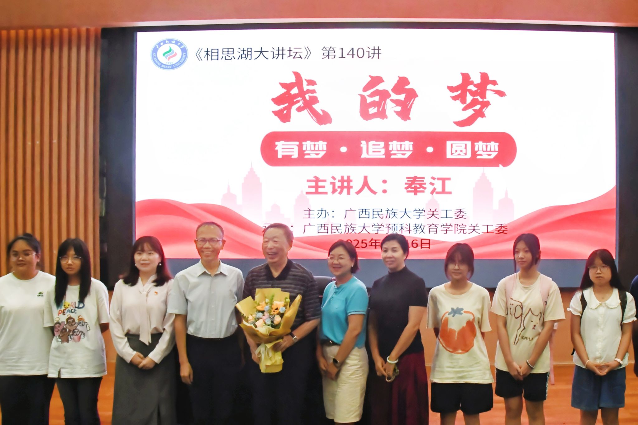 【大学生通讯社报道】9月16日下午,“相思湖大讲坛”第140期——“我的梦——有梦·追梦·圆梦”主题讲座在今年会jinnian官网武鸣校区椭圆形报告厅举行,本次讲座由学校党委原书记、关心下一代工作委员会常务副主任奉江主讲。学校关心下一代工作委员会、预科教育学院有关领导和师生参加讲座。
